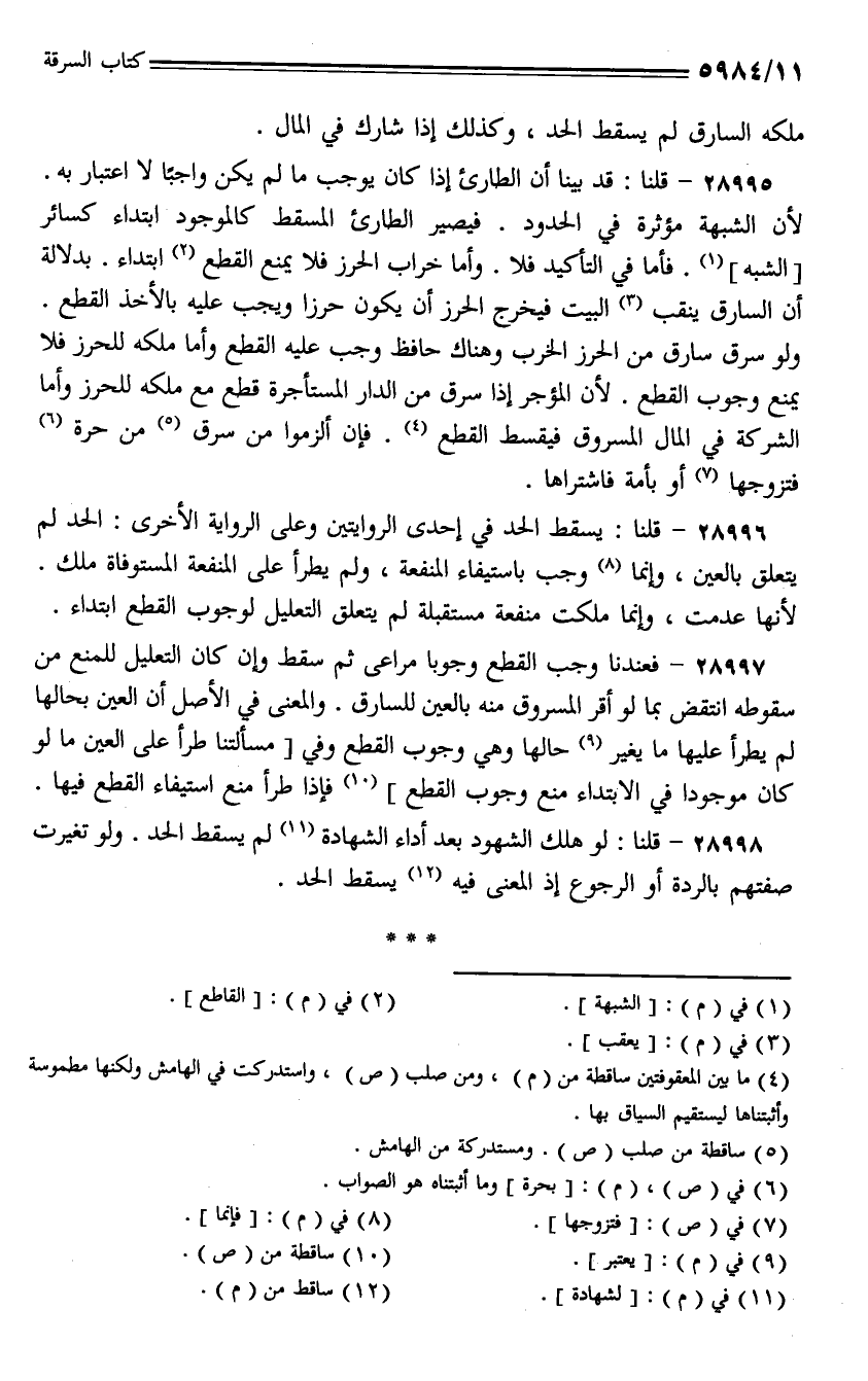 28995 - قلنا: قد بينا أن الطارئ إذا كان يوجب ما لم يكن واجبًا لا اعتبار به. لأن الشبهة مؤثرة في الحدود. فيصير الطارئ المسقط كالوجود ابتداء كسائر [الشبه]. فأما في التأكيد فلا. وأما خراب الحرز فلا يمنع القطع ابتداء. بدلالة أن السارق ينقب البيت فيخرج الحرز أن يكون حرزا ويجب عليه بالأخذ القطع. ولو سرق سارق من الحرز الخرب وهناك حافظ وجب عليه القطع وأما ملكه للحر فلا يمنع وجوب القطع. لأن المؤجر إذا سرق من الدار المستأجرة قطع مع ملكه للحرز وأما الشركة في المال المسروق فيقسط القطع. فإن ألزموا من سرق من حرة فتزوجها أو بأمة فاشتراها.