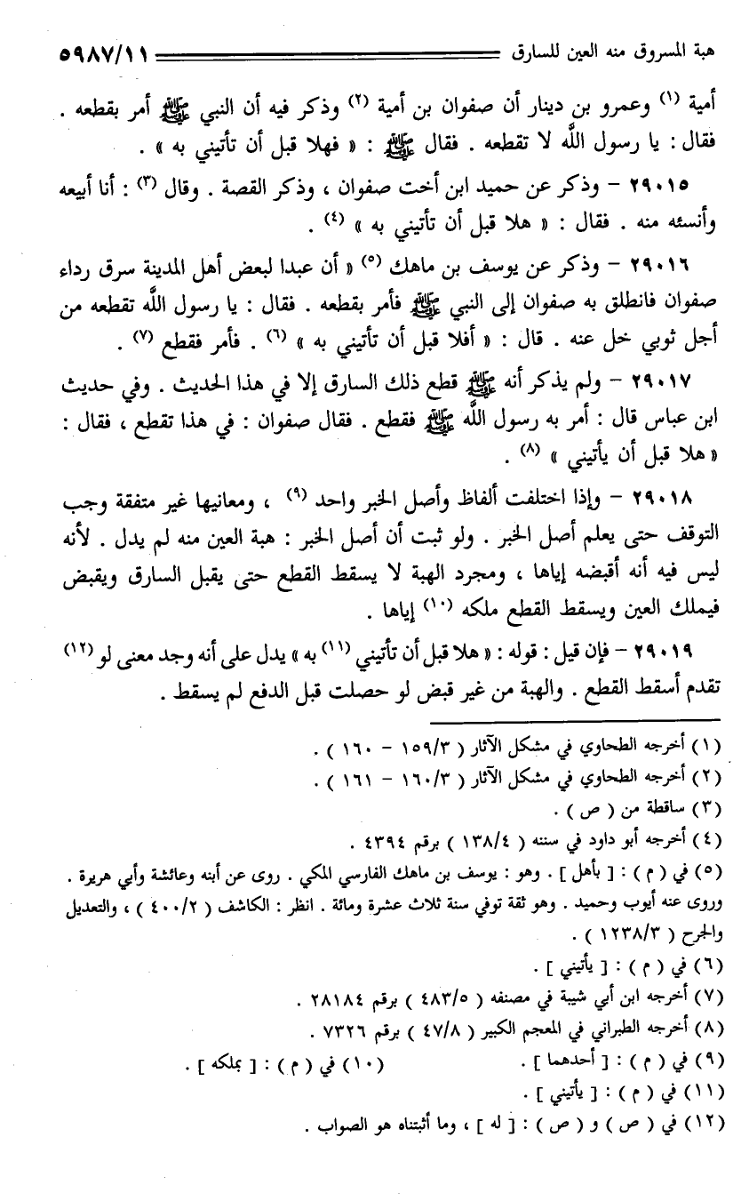 29018 - وإذا اختلفت ألفاظ وأصل الخبر واحد، ومعانيها غير متفقة وجب التوقف حتى يعلم أصل الخبر. ولو ثبت أن أصل الخبر: هبة العين منه لم يدل. لأنه ليس فيه أنه أقبضه إياها، ومجرد الهبة لا يسقط القطع حتى يقبل السارق ويقبض فيملك العين ويسقط القطع ملكه إياها.