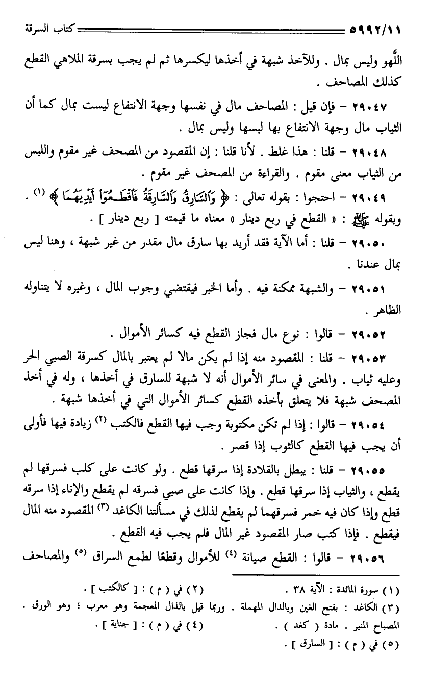 29053 - قلنا: المقصود منه إذا لم يكن مالا لم يعتبر بالمال كسرقة الصبي الحر وعليه ثياب. والمعنى في سائر الأموال أنه لا شبهة للسارق في أخذها، وله في أخذ المصحف شبهة فلا يتعلق بأخذه القطع كسائر الأموال التي في أخذها شبهة.