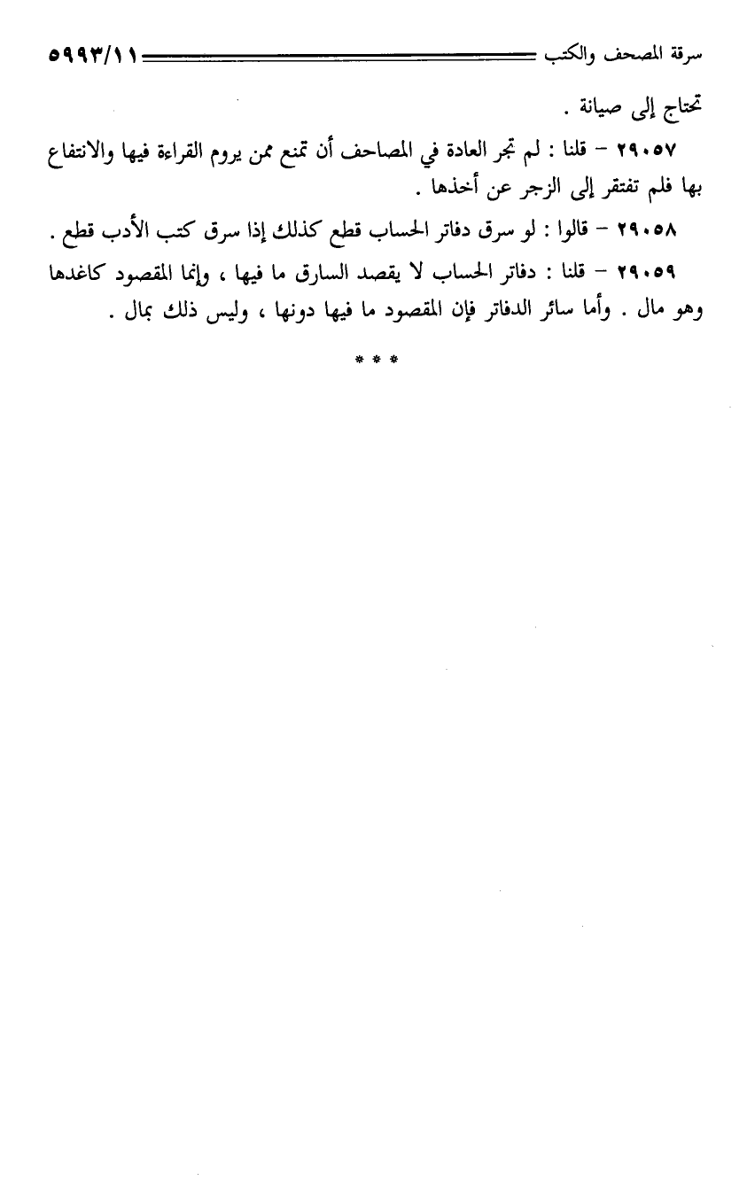 29059 - قلنا: دفاتر الحساب لا يقصد السارق ما فيها، وإنما المقصود كاغدها وهو مال. وأما سائر الدفاتر فإن المقصود ما فيها دونها، وليس ذلك بمال.