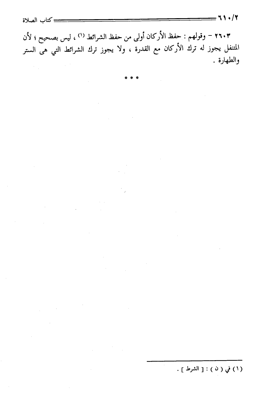 2603 - وقولهم: حفظ الأركان أولى من حفظ الشرائط، ليس بصحيح؛ لأن المتنفل يجوز له ترك الأركان مع القدرة، ولا يجوز ترك الشرائط التي هي الستر والطهارة.