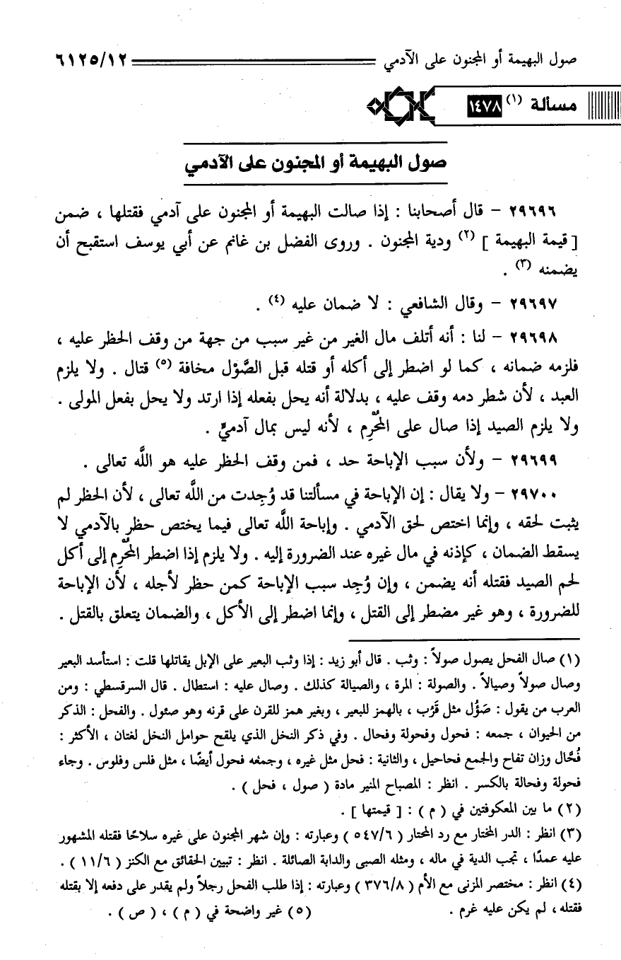 29696 - قال أصحابنا: إذا صالت البهيمة أو المجنون على آدمي فقتلها، ضمن [قيمة البهيمة] ودية المجنون. وروى الفضل بن غانم عن أبي يوسف استقبح أن يضمنه.