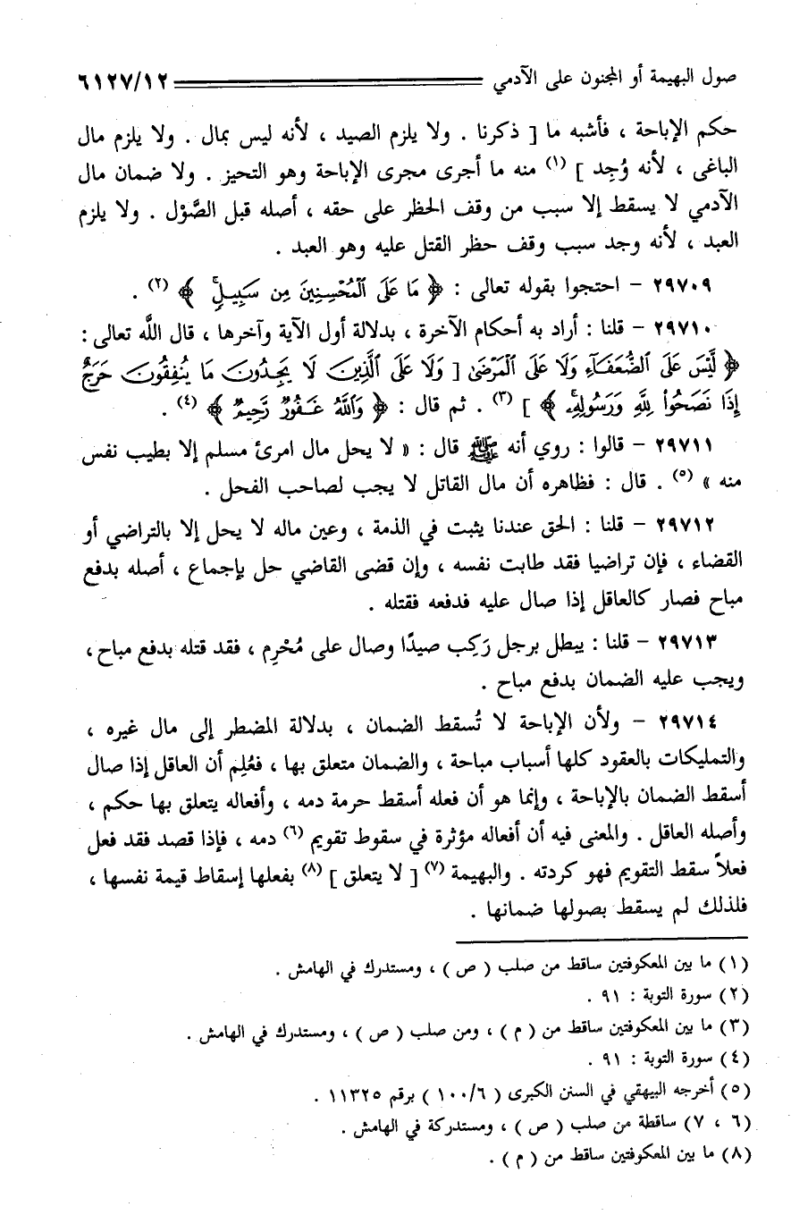 29714 - ولأن الإباحة لا تسقط الضمان، بدلالة المضطر إلى مال غيره، والتمليكات بالعقود كلها أسباب مباحة، والضمان متعلق بها، فعلم أن العاقل إذا صال أسقط الضمان بالإباحة، وإنما هو أن فعله أسقط حرمة دمه، وأفعاله يتعلق بها حكم، وأصله العاقل. والمعنى فيه أن أفعاله مؤثرة في سقوط تقويم دمه، فإذا قصد فقد فعل فعلاً سقط التقويم فهو كردته. والبهيمة [لا يتعلق] بفعلها إسقاط قيمة نفسها، فلذلك لم يسقط بصولها ضمانها.