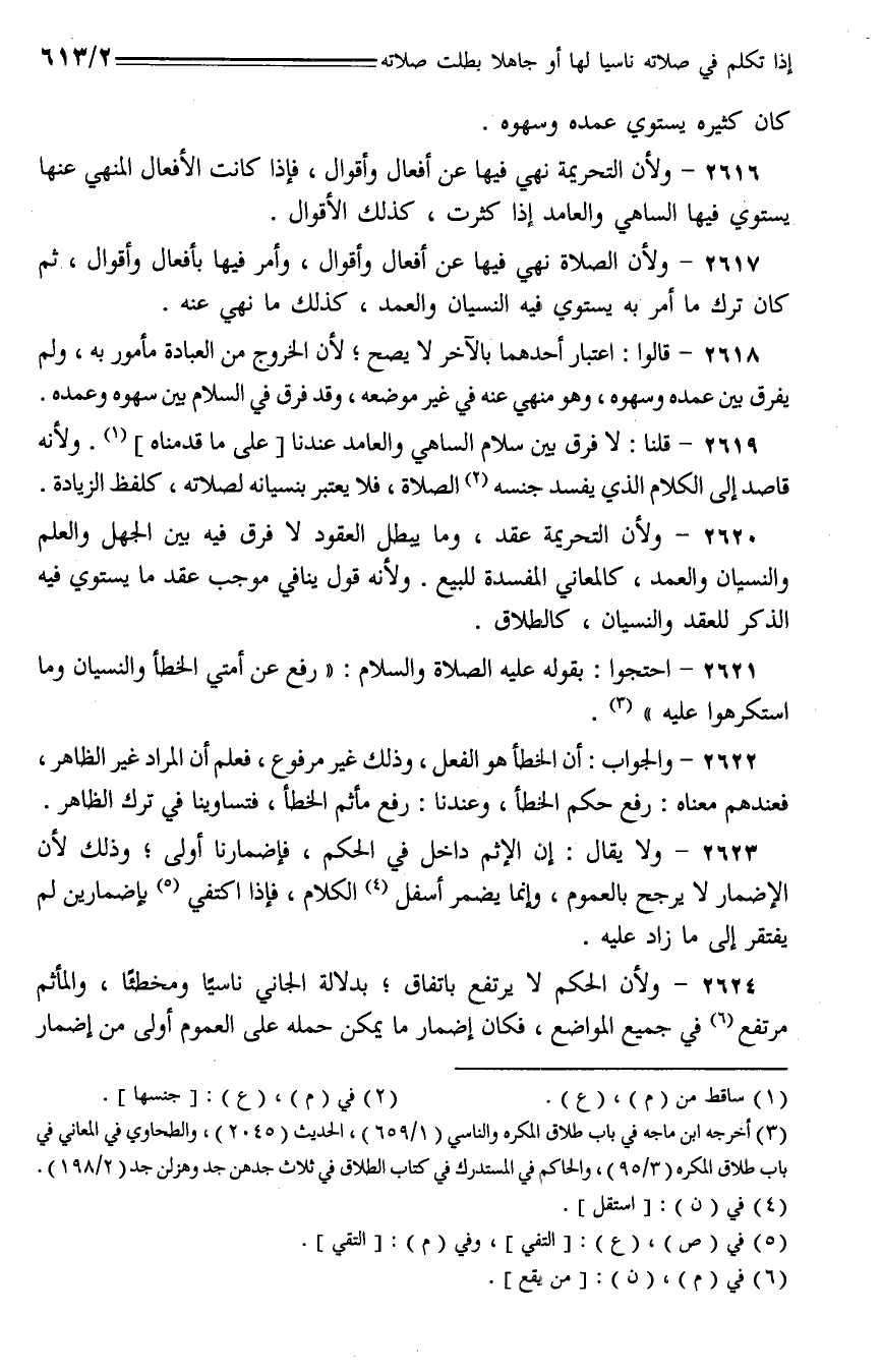 2616 - ولأن التحريمة نهي فيها عن أفعال وأقوال، فإذا كانت الأفعال المنهي عنها يستوي فيها الساهي والعامد إذا كثرت، كذلك الأقوال.
