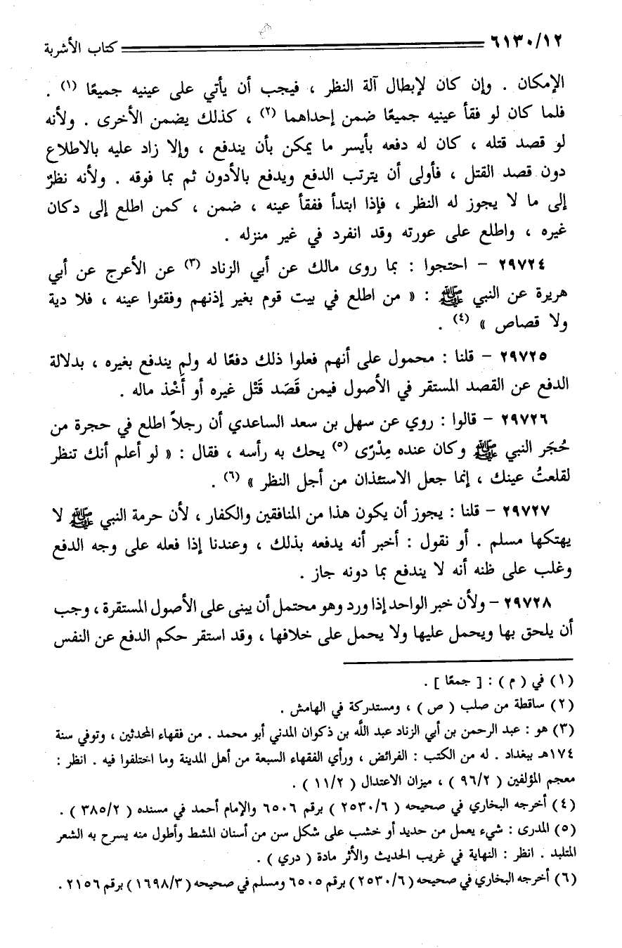 29724 - احتجوا: بما روى مالك عن أبي الزناد عن الأعرج عن أبي هريرة عن النبي - صلى الله عليه وسلم -: (من اطلع في بيت قوم بغير إذنهم وفقئوا عينه، فلا دية ولا قصاص).