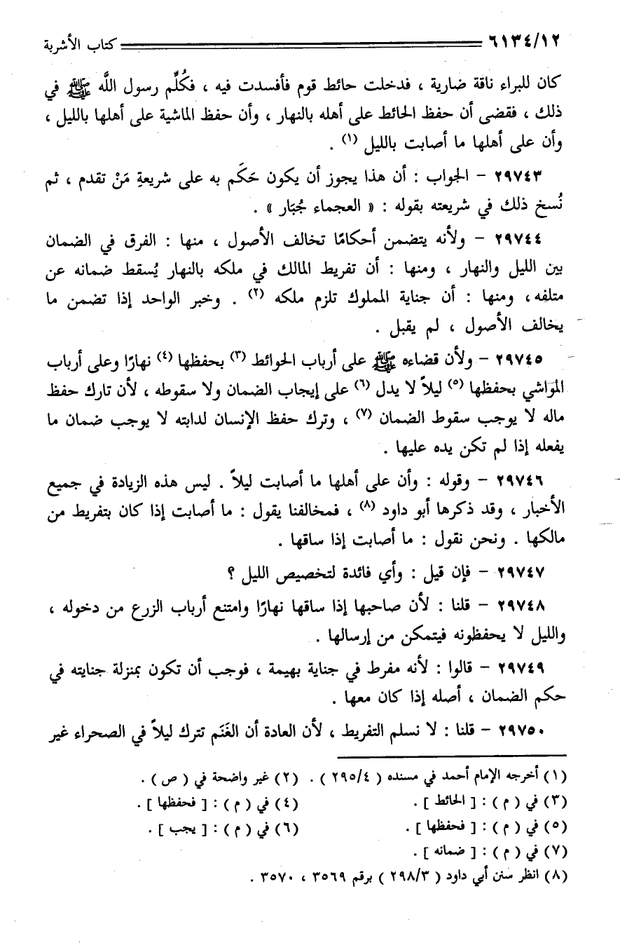 29746 - وقوله: وأن على أهلها ما أصابت ليلًا. ليس هذه الزيادة في جميع الأخبار، وقد ذكرها أبو داود، فمخالفنا يقول: ما أصابت إذا كان بتفريط من مالكها. ونحن نقول: ما أصابت إذا ساقها.