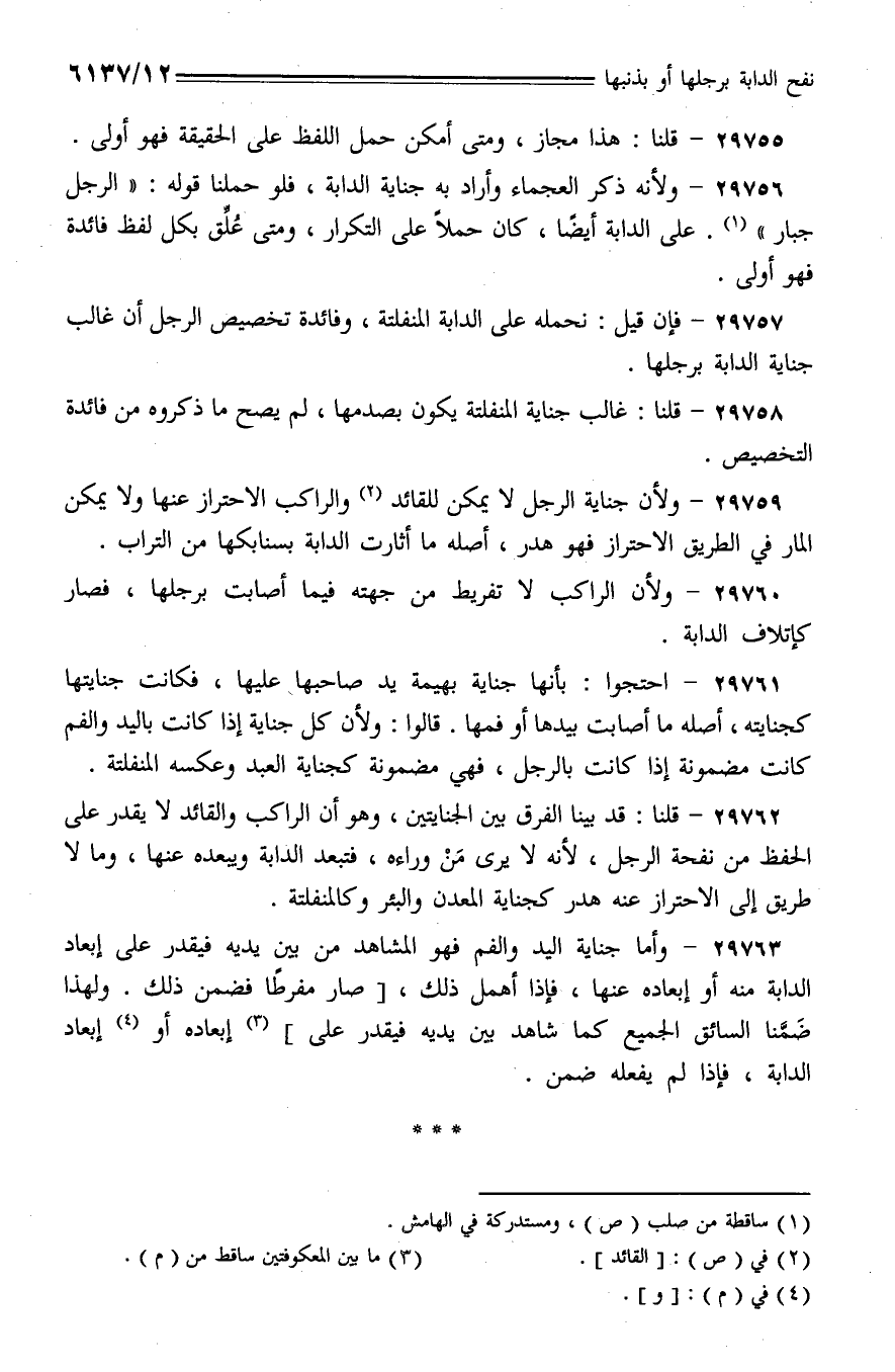 29757 - فإن قيل: نحمله على الدابة المنفلتة، وفائدة تخصيص الرجل أن غالب جناية الدابة برجلها.