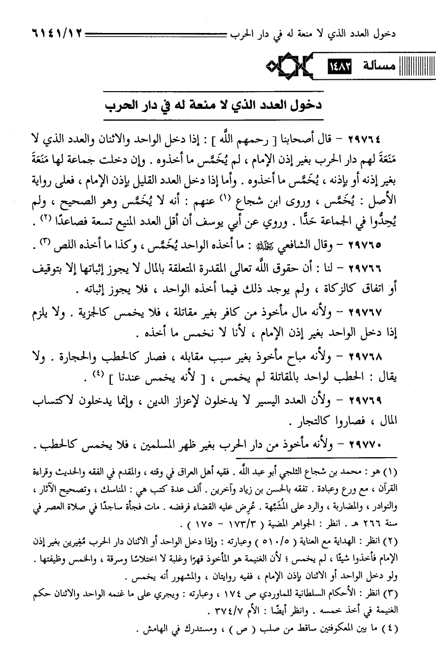 29764 - قال أصحابنا [رحمهم الله]: إذا دخل الواحد والاثنان والعدد الذي لا منعة لهم دار الحرب بغير إذن الإمام، لم يخمس ما أخذوه. وإن دخلت جماعة لها منعة بغير إذنه أو بإذنه، يخمس ما أخذوه. وأما إذا دخل العدد القليل بإذن الإمام، فعلى رواية الأصل: يخمس، وروى ابن شجاع عنهم: أنه لا يخمس وهو الصحيح، ولم يحدوا في الجماعة حدًا. وروي عن أبي يوسف أن أقل العدد المنيع تسعة فصاعدًا.
