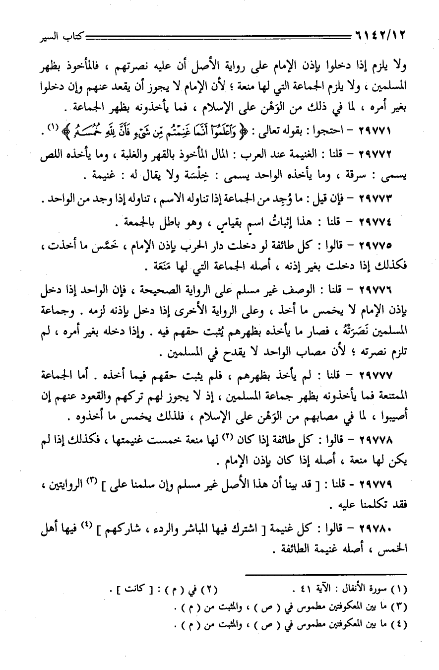29778 - قالوا: كل طائفة إذا كان لها منعة خمست غنيمتها، فكذلك إذا لم يكن لها منعة، أصله إذا كان بإذن الإمام.