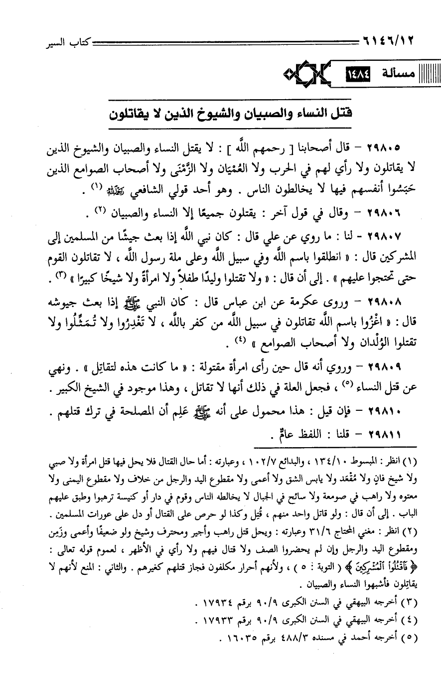 29805 - قال أصحابنا [رحمهم الله]: لا يقتل النساء والصبيان والشيوخ الذين لا يقاتلون ولا رأي لهم في الحرب ولا العميان ولا الزمني ولا أصحاب الصوامع الذين حبسوا أنفسهم فيها لا يخالطون الناس. وهو أحد قولي الشافعي رحمه الله.