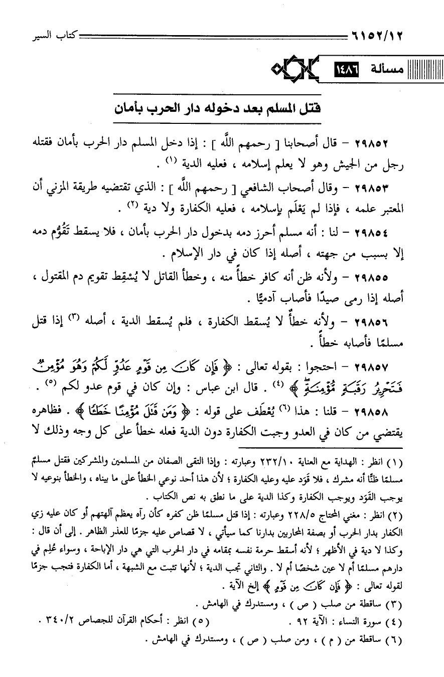 29852 - قال أصحابنا [رحمهم الله]: إذا دخل المسلم دار الحرب بأمان فقتله رجل من الجيش وهو لا يعلم إسلامه، فعليه الدية.