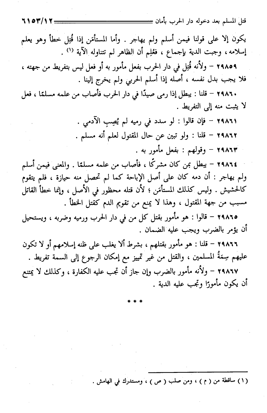 29865 - قالوا: هو مأمور بقتل كل من في دار الحرب ورميه وضربه، ويستحيل أن يؤمر بالضرب ويجب عليه الضمان.