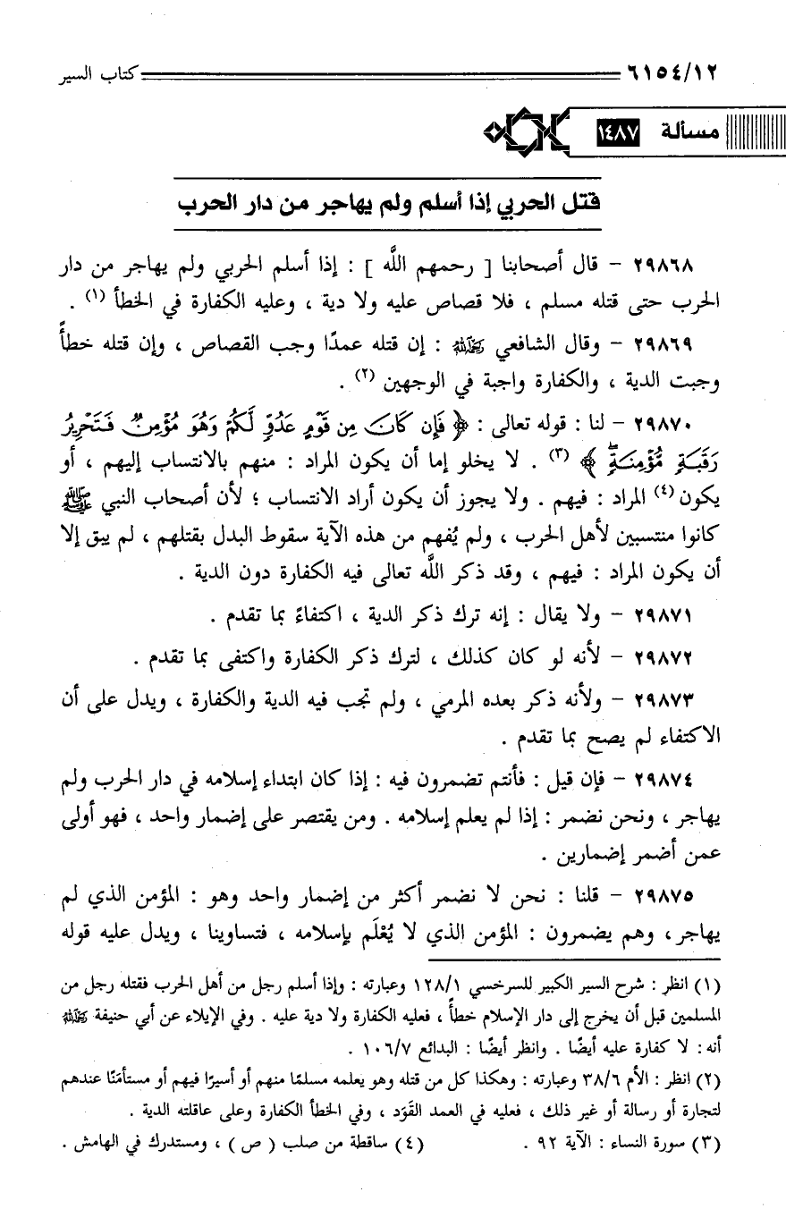 29868 - قال أصحابنا [رحمهم الله]: إذا أسلم الحربي ولم يهاجر من دار الحرب حتى قتله مسلم، فلا قصاص عليه ولا دية، وعليه الكفارة في الخطأ.