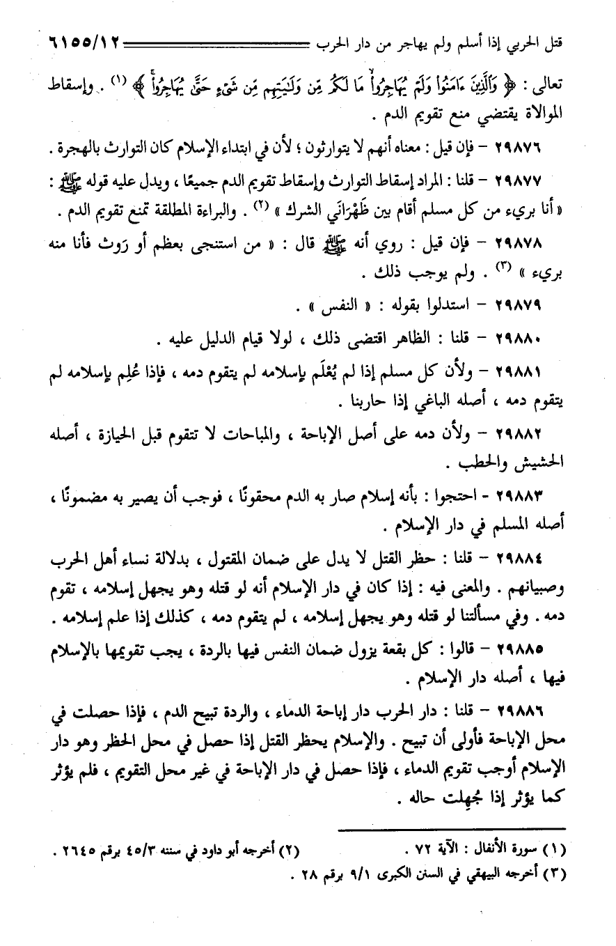29877 - قلنا: المراد إسقاط التوارث وإسقاط تقويم الدم جميعًا، ويدل عليه قوله - صلى الله عليه وسلم -: (أنا برئ من كل مسلم أقام بين ظهراني الشرك). والبراءة المطلقة تمنع تقويم الدم.