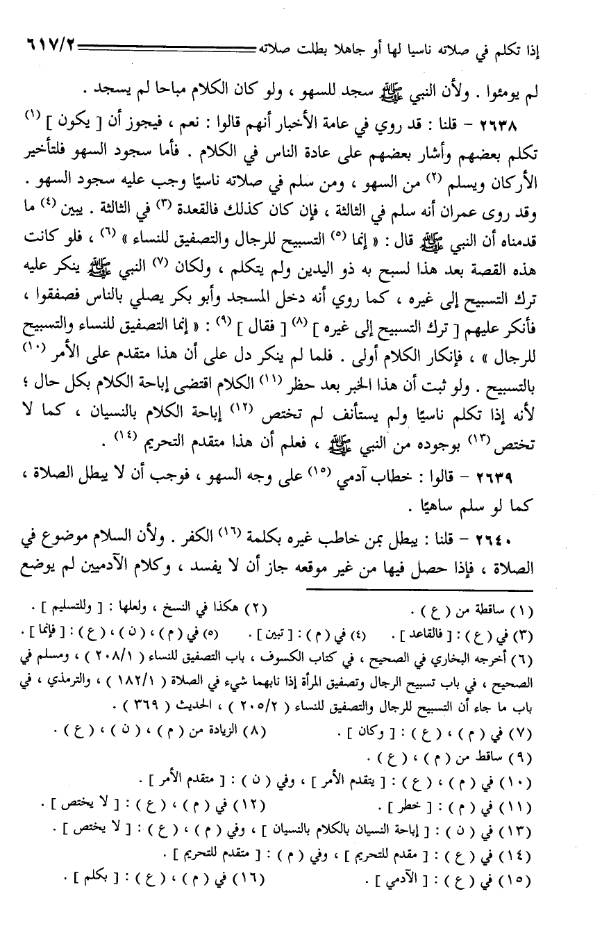 2640 - قلنا: يبطل بمن خاطب غيره بكلمة الكفر. ولأن السلام موضوع في الصلاة، فإذا حصل فيها من غير موقعه جاز أن لا يفسد، وكلام الآدميين لم يوضع
