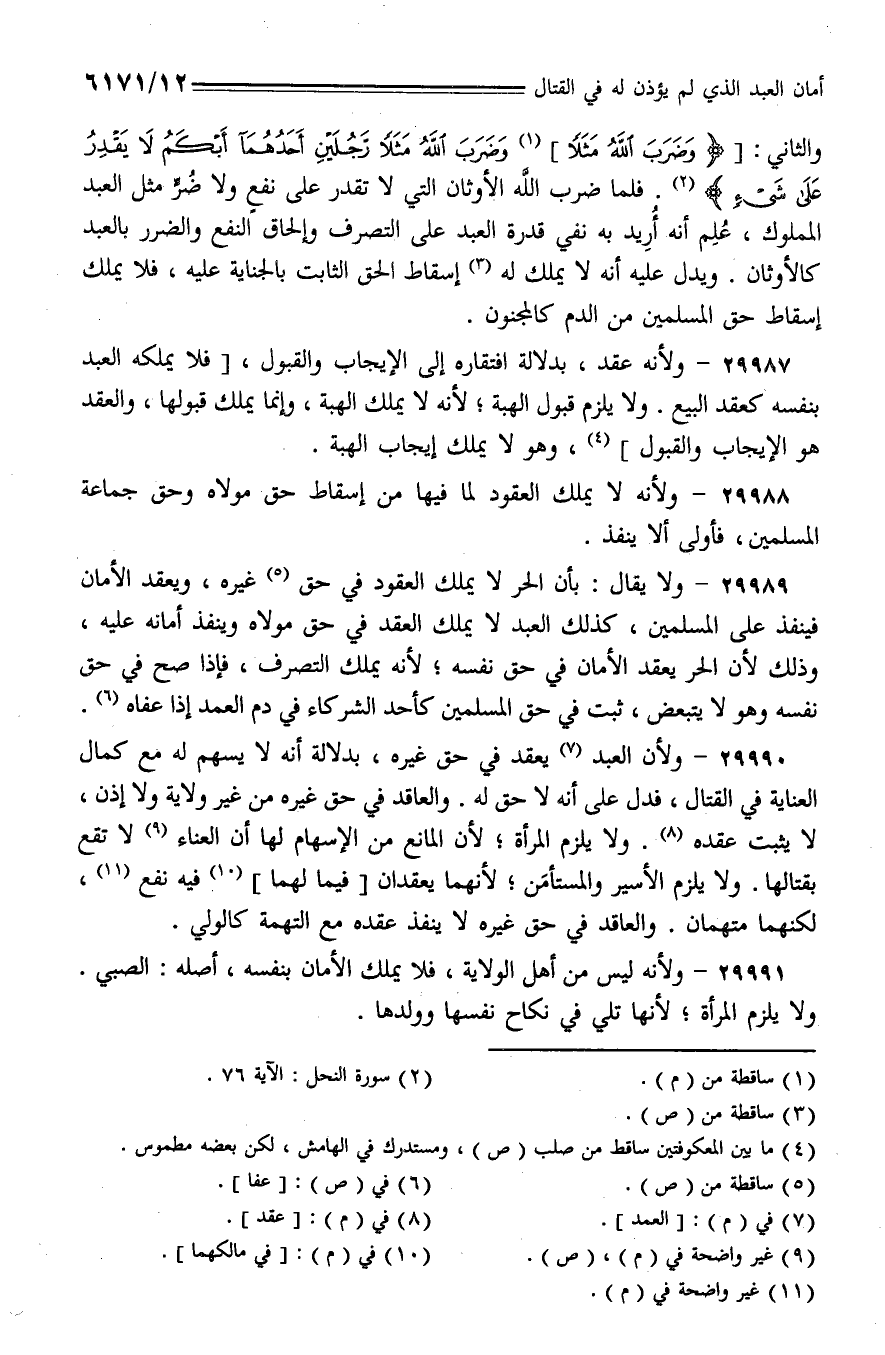 29989 - ولا يقال: بأن الحر لا يملك العقود في حق غيره، ويعقد الأمان فينفذ على المسلمين، كذلك العبد لا يملك العقد في حق مولاه وينفذ أمانه عليه، وذلك لأن الحر يعقد الأمان في حق نفسه؛ لأنه يملك التصرف، فإذا صح في حق نفسه وهو لا يتبعض، ثبت في حق المسلمين كأحد الشركاء في دم العمد إذا عفاه.