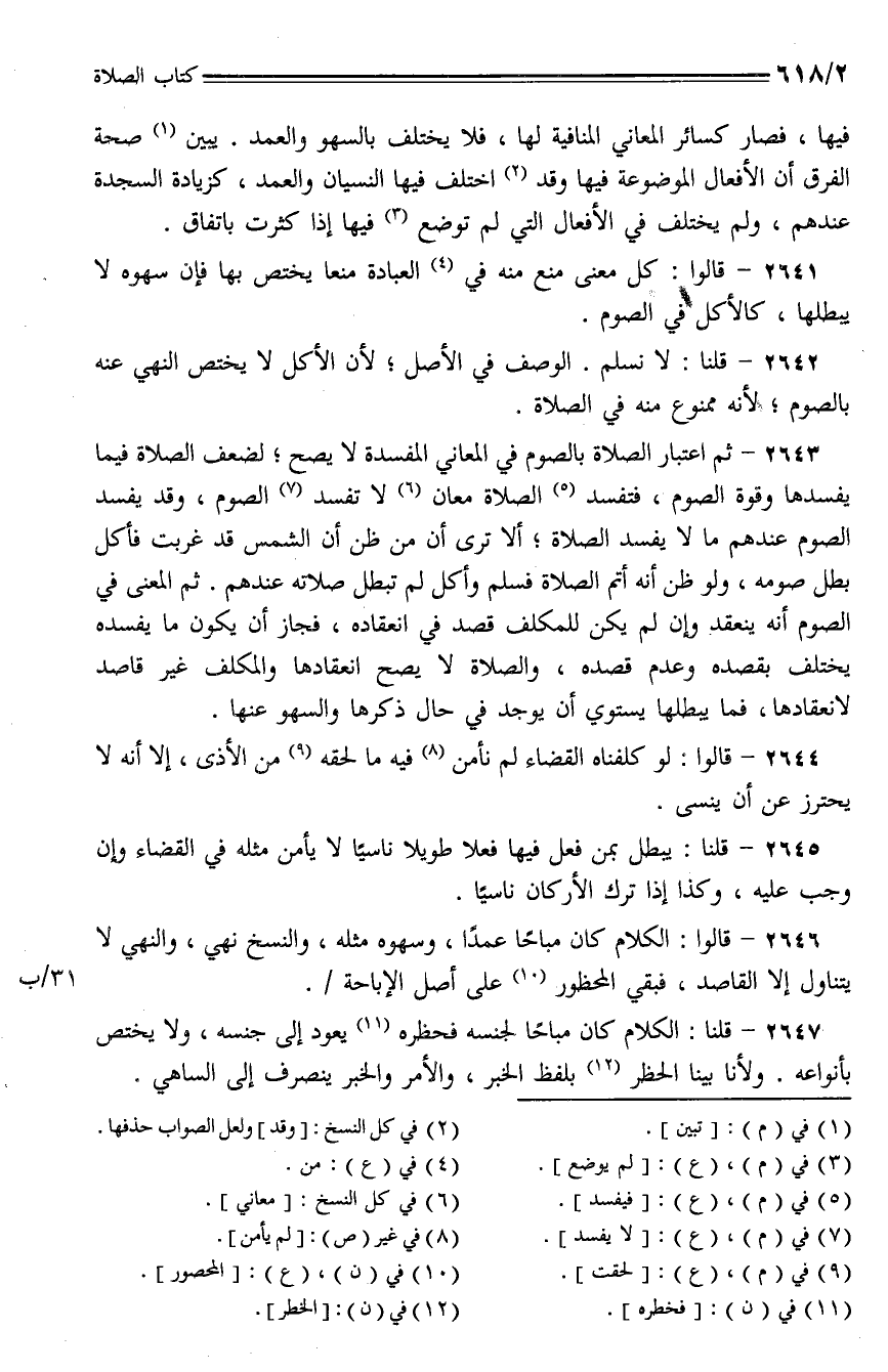 2646 - قالوا: الكلام كان مباحا عمدا، وسهوه مثله، والنسخ نهي، والنهي لا يتناول إلا القاصد، فبقي المحظور على أصل الإباحة/.