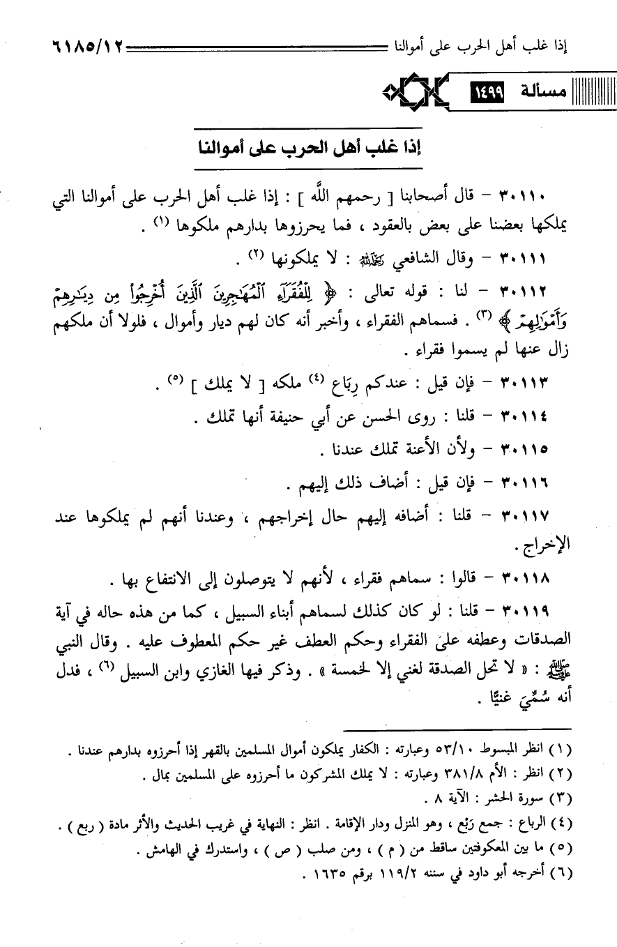 30110 - قال أصحابنا [رحمهم الله]: إذا غلب أهل الحرب على أموالنا التي يملكها بعضنا على بعض بالعقود، فما يحرزوها بدارهم ملكوها.