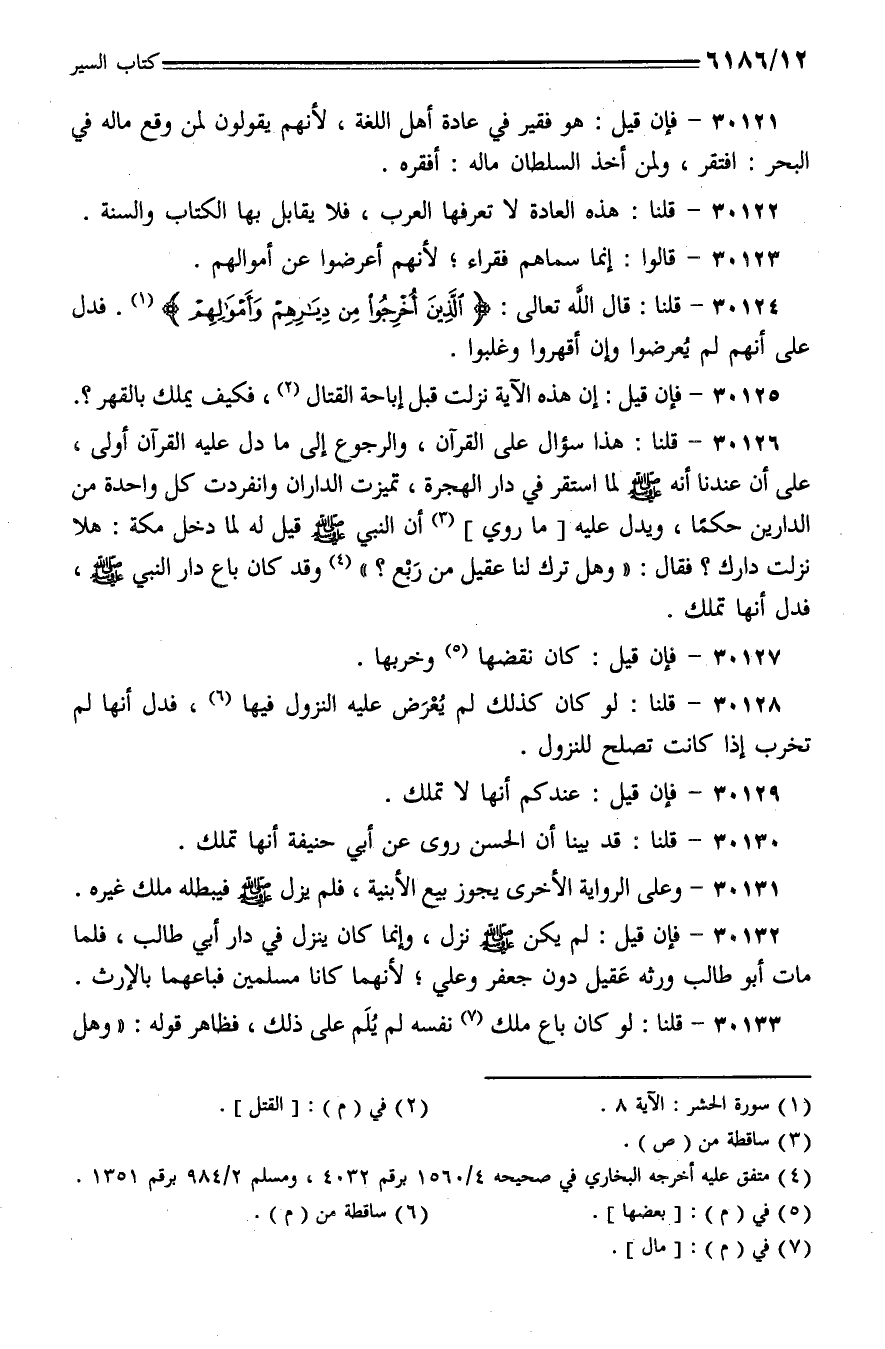 30126 - قلنا: هذا سؤال على القرآن، والرجوع إلى ما دل عليه القرآن أولى، على أن عندنا أنه - صلى الله عليه وسلم - لما استقر في دار الهجرة، تميزت الداران وانفردت كل واحدة من الدارين حكمًا، ويدل عليه [ما روي] أن النبي - صلى الله عليه وسلم - قيل له لما دخل مكة: هلا نزلت دارك؟ فقال: (وهل ترك لنا عقيل من ربع؟) وقد كان باع دار النبي - صلى الله عليه وسلم -، فدل أنها تملك؟