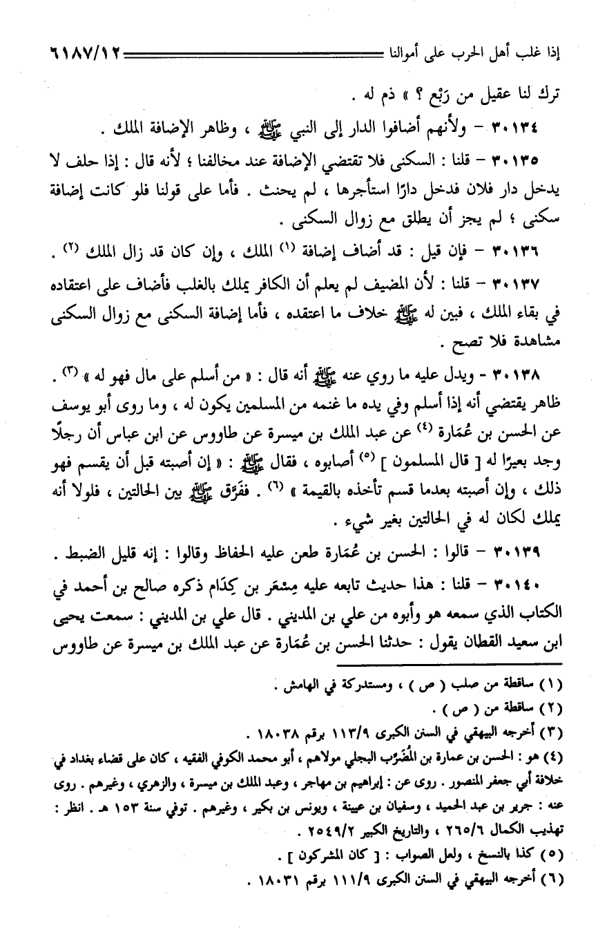 30138 - ويدل عليه ما روي عنه - صلى الله عليه وسلم - أنه قال: (من أسلم على مال فهو له). ظاهر يقتضي أنه إذا أسلم وفي يده غنمه من المسلمين يكون له، وما روى أبو يوسف عن الحسن بن عمارة عن عبد الملك بن ميسرة عن طاووس عن ابن عباس أن رجلاً وجد بعيرًا له [قال المسلمون] أصابوه، فقال - صلى الله عليه وسلم - (إن أصبته قبل أن يقسم فهو ذلك، وإن أصبته بعدما قسم تأخذه بالقيمة). ففرق - صلى الله عليه وسلم - بين الحالتين، فلولا أنه يملك لكان له في الحالتين بغير شيء.