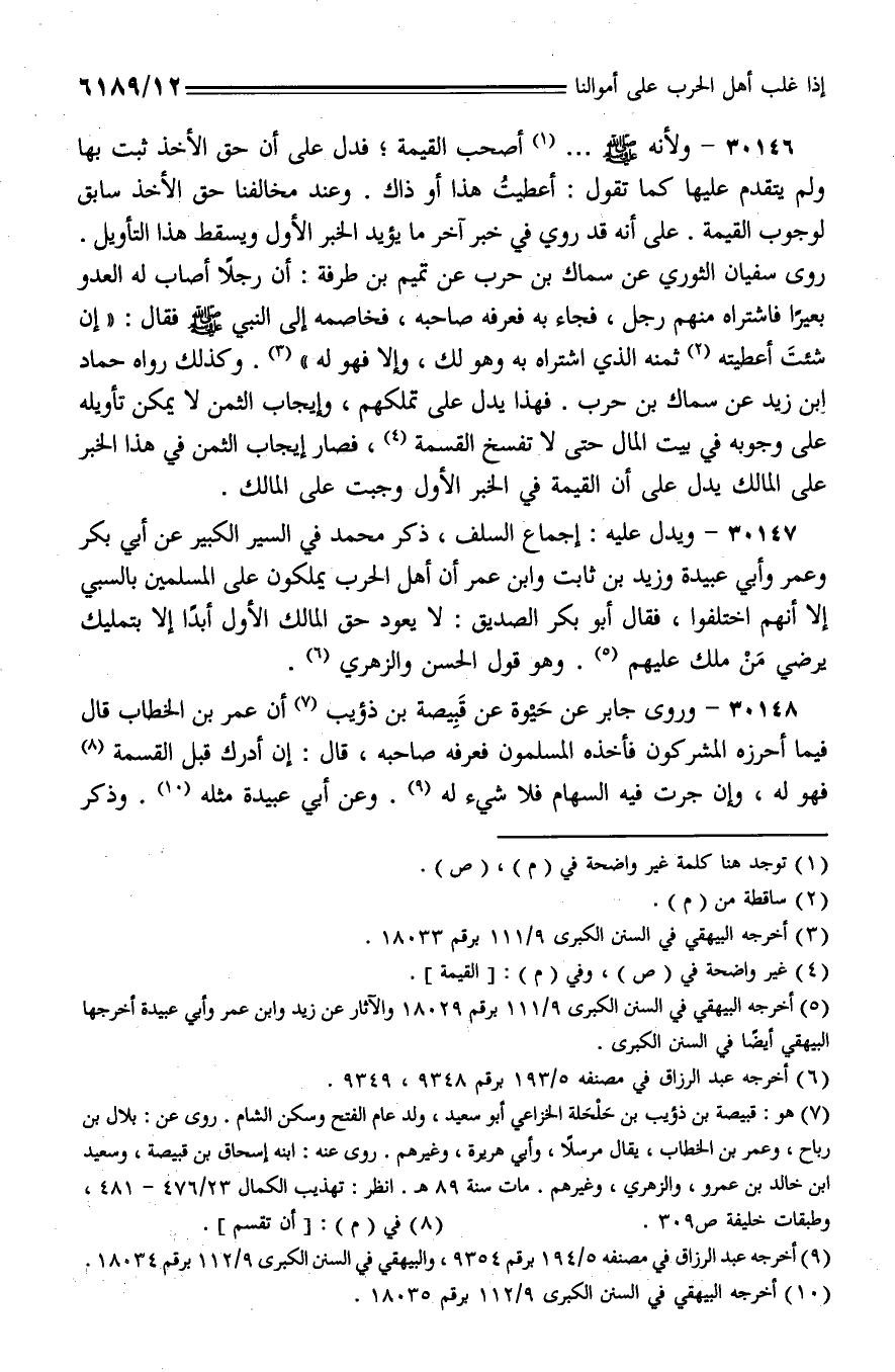 30148 - وروى جابر عن حيوة عن قبيصة بن ذؤيب أن عمر بن الخطاب قال فيما أحرز المشركون فأخذه المسلمون فعرفه صاحبه، قال: إن أدرك قبل القسمة فهو له، وإن جرت فيه السهام فلا شيء له. وعن أبي عبيدة مثله. وذكر
