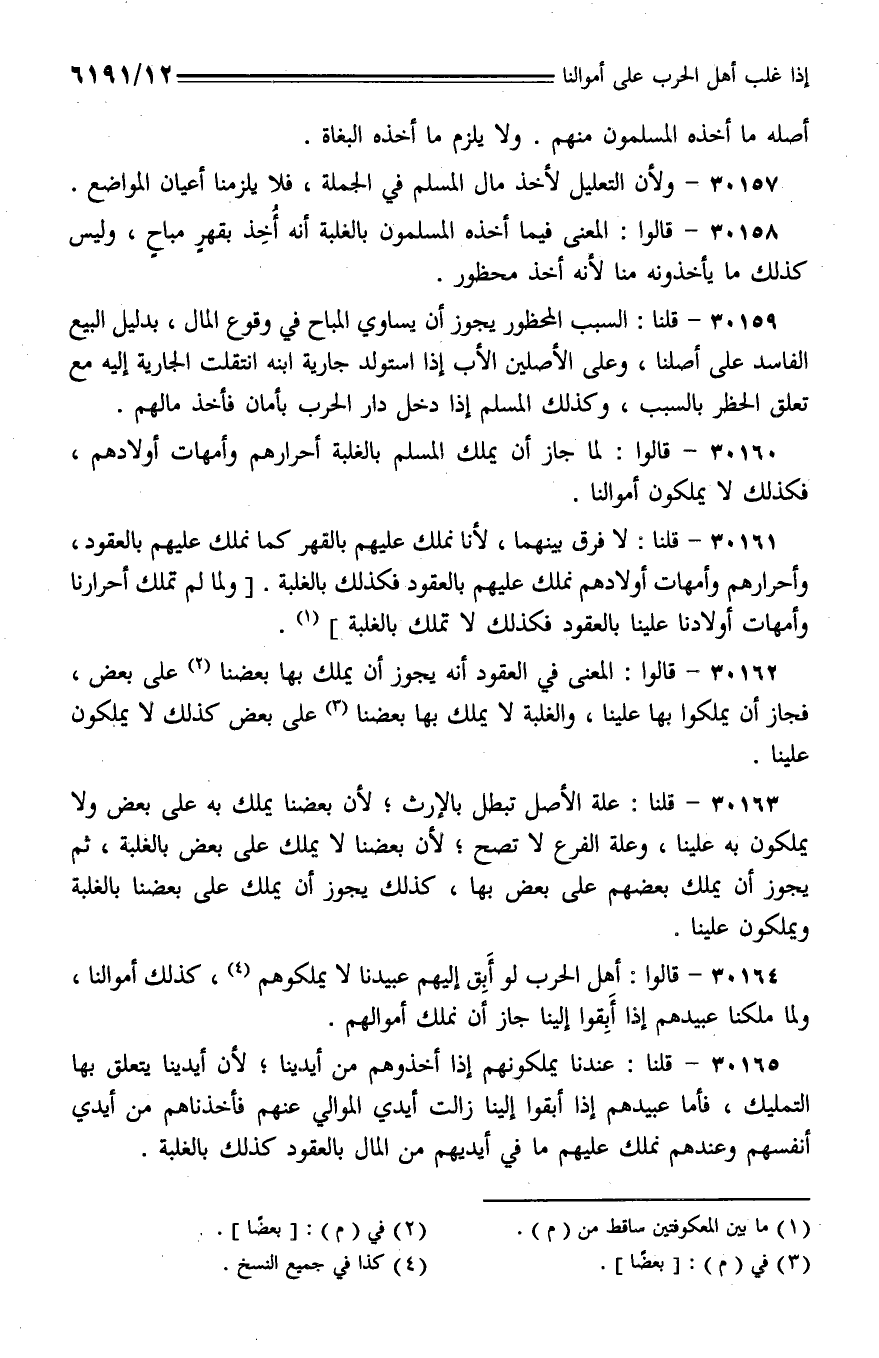 30160 - قالوا: لما جاز أن يملك المسلم بالغلبة أحرارهم وأمهات أولادهم، فكذلك لا يملكون أموالنا.