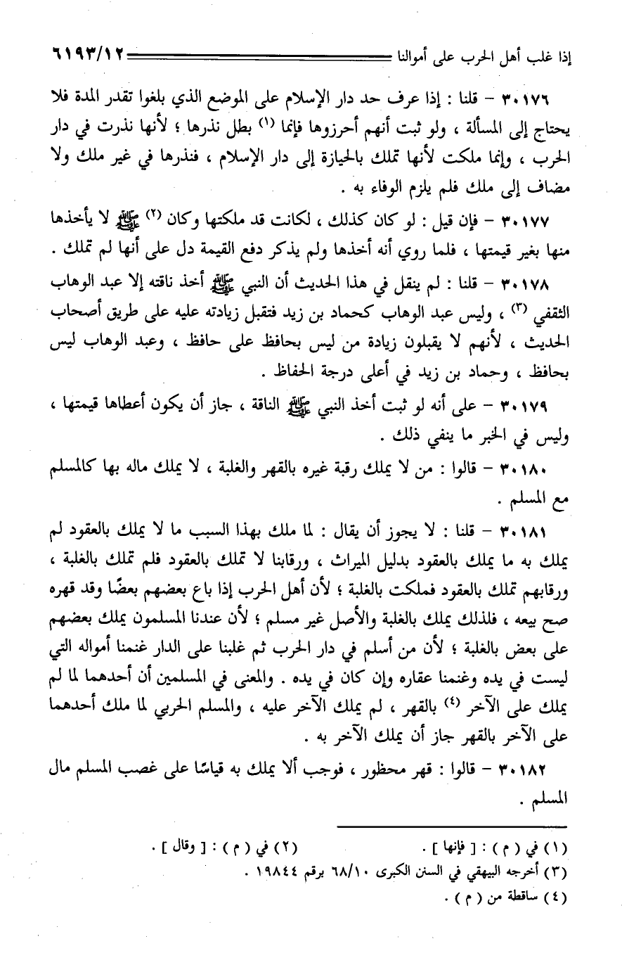 30180 - قالوا: من لا يمل رقبة غيره بالقهر والغلبة، لا يملك ماله بها كالمسلم مع المسلم.