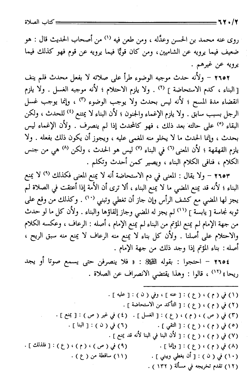 2652 - ولأنه حدث موجبه الوضوء طرأ على صلاته لا بفعل محدث فلم ينف [البناء، كدم الاستحاضة]. ولا يلزم الاحتلام؛ لأنه موجبه الغسل. ولا يلزم انقضاء مدة المسح؛ لأنه ليس بحدث ولا يوجب الوضوء، وإنما يوجب غسل الرجل بسبب سابق. ولا يلزم الإغماء والجنون؛ لأن البناء لا يمتنع للحدث، ولكن البقاء على حالته بعد ذلك، فهو كالمحدث إذا لم ينصرف. ولأن الإغماء ليس بحدث، وإنما الحدث ما لا يخلو منه المغمى عليه، ويجوز أن يكون ذلك بفعله. ولا يلزم القهقهة؛ لأن المعنى في البناء ليس هو الحدث، ولكن هي من جنس الكلام، فنافى الكلام البناء، ويصير كمن أحدث وتكلم.