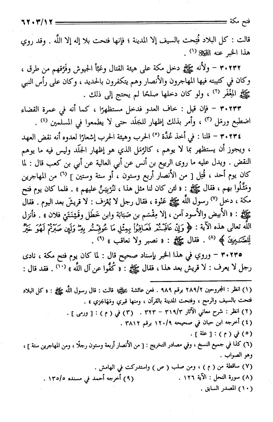 30232 - ولأنه - صلى الله عليه وسلم - دخل مكة على هيئة القتال وعبأ الجيوش وفرقهم من طرق، وكان في كتيبته في المهاجرون والأنصار وهم يتكفرون بالحديد، وكان على رأس النبي - صلى الله عليه وسلم - المغفر، ولو كان دخلها صلحًا لم يحتج إلى ذلك.