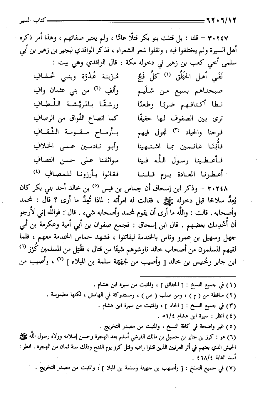30247 - قلنا: بل قتلت بنو بكر قتلًا عامًا، ولم يعتبر صفاتهم، وهذا أمر ذكره أهل السيرة ولم يختلفوا فيه، ونقلوا شعر الشعراء، فذكر الواقدي لبجير بن زهير بن أبي سلمى أخي كعب بن زهير في دخوله مكة، قال الواقدي وهي بيت:
