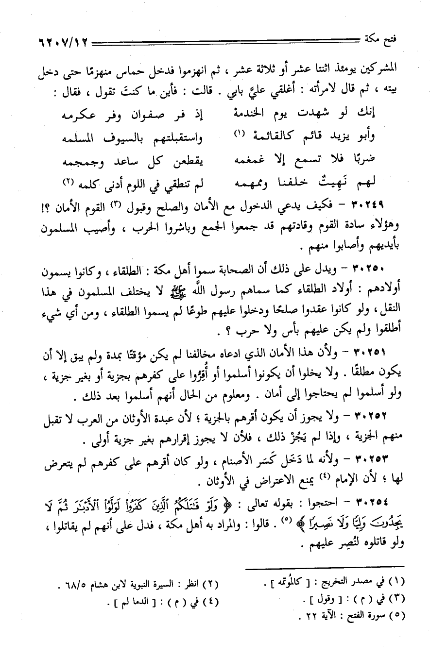 30251 - ولأن هذا الأمان الذي ادعاه مخالفنا لم يكن مؤقتًا بمدة ولم يبق إلا أن يكون مطلقًا. ولا يخلوا أن يكونوا أسلموا أو أقروا على كفرهم بجزية أو بغير جزية، ولو أسلموا لم يحتاجوا إلى أمان. ومعلوم من الحال أنهم أسلموا بعد ذلك.