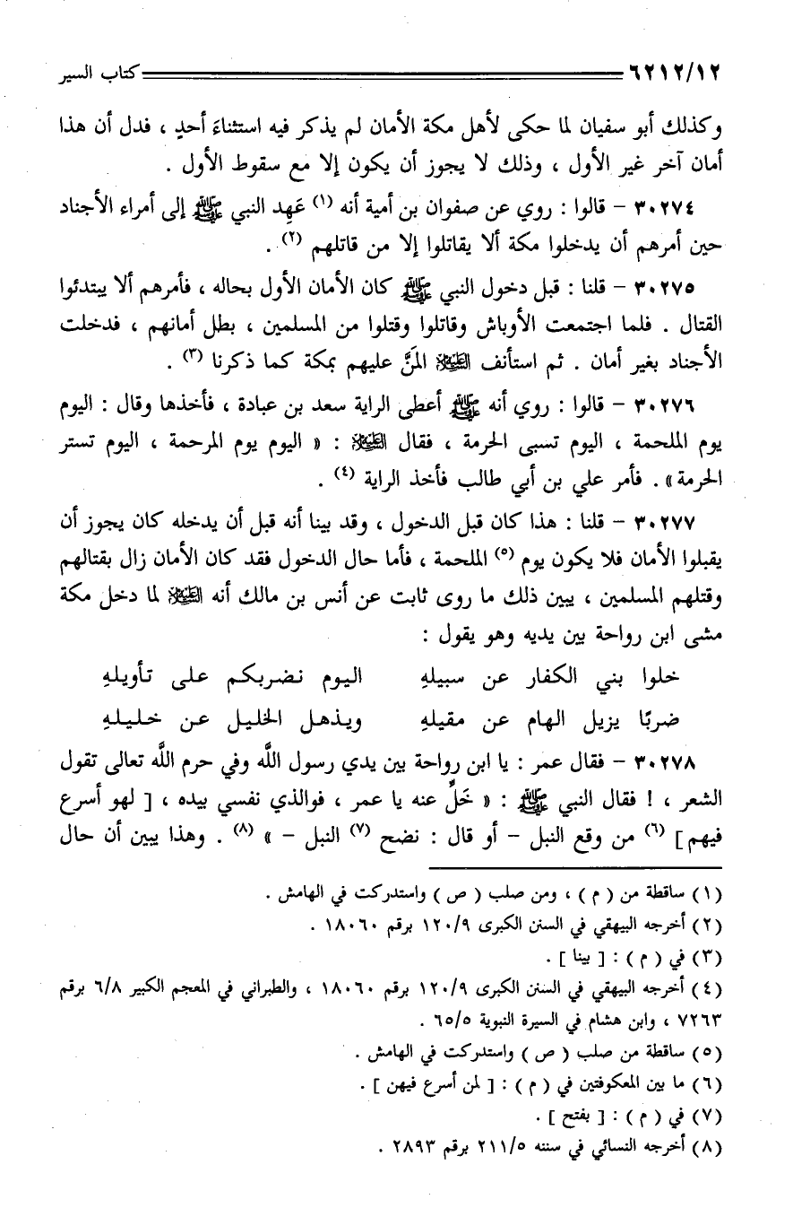 30274 - قالوا: روي عن صفوان بن أمية أنه عهد النبي - صلى الله عليه وسلم - إلى أمراء الأجناد حين أمرهم أن يدخلوا مكة ألا يقاتلوا إلا من قاتلهم.