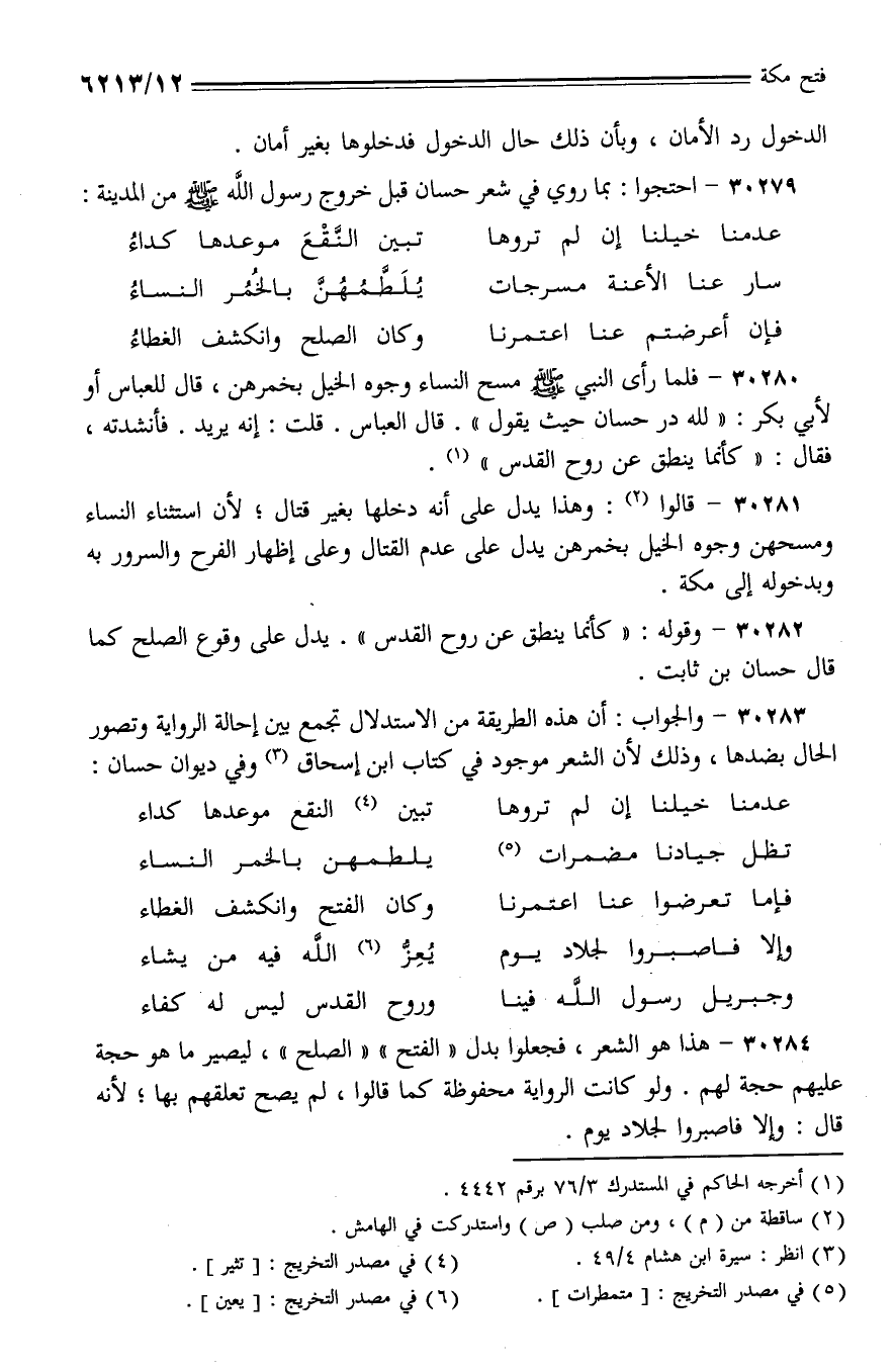 30283 - والجواب: أن هذه الطريقة من الاستدلال تجمع بين إحالة الرواية وتصور الحال بضدها، وذلك لأن الشعر موجود في كتاب ابن إسحاق وفي ديوان حسان: