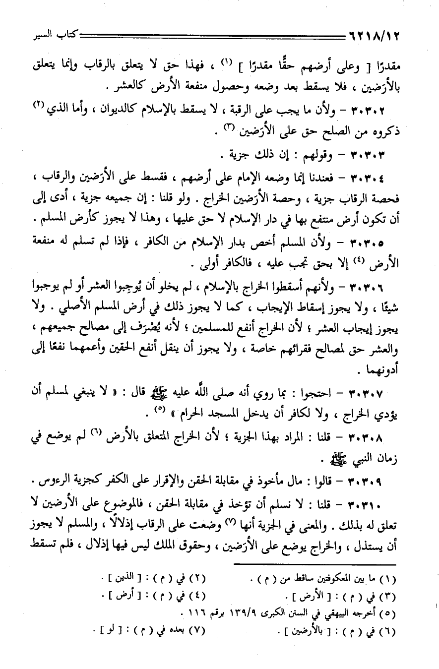 30306 - ولأنهم أسقطوا الخراج بالإسلام، لم يخلو أن يوجبوا العشر أو لم يوجبوا شيئًا، ولا يجوز إسقاط الإيجاب، كما لا يجوز ذلك في أرض المسلم الأصلي. ولا يجوز إيجاب العشر؛ لأن الخراج أنفع للمسلمين؛ لأنه يصرف إلى مصالح جميعهم، والعشر حق لمصالح فقرائهم خاصة، ولا يجوز أن ينقل أنفع الحقين وأعمهما نفعًا إلى أدونهما.