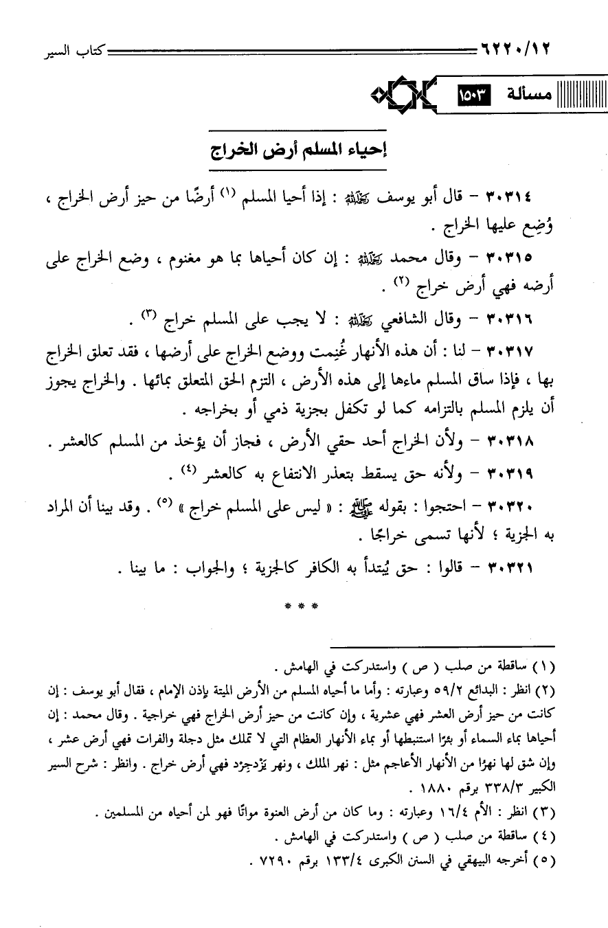 30320 - احتجوا: بقوله - صلى الله عليه وسلم -: (ليس على المسلم خراج). وقد بينا أن المراد به الجزية؛ لأنها تسمى خرجًا.