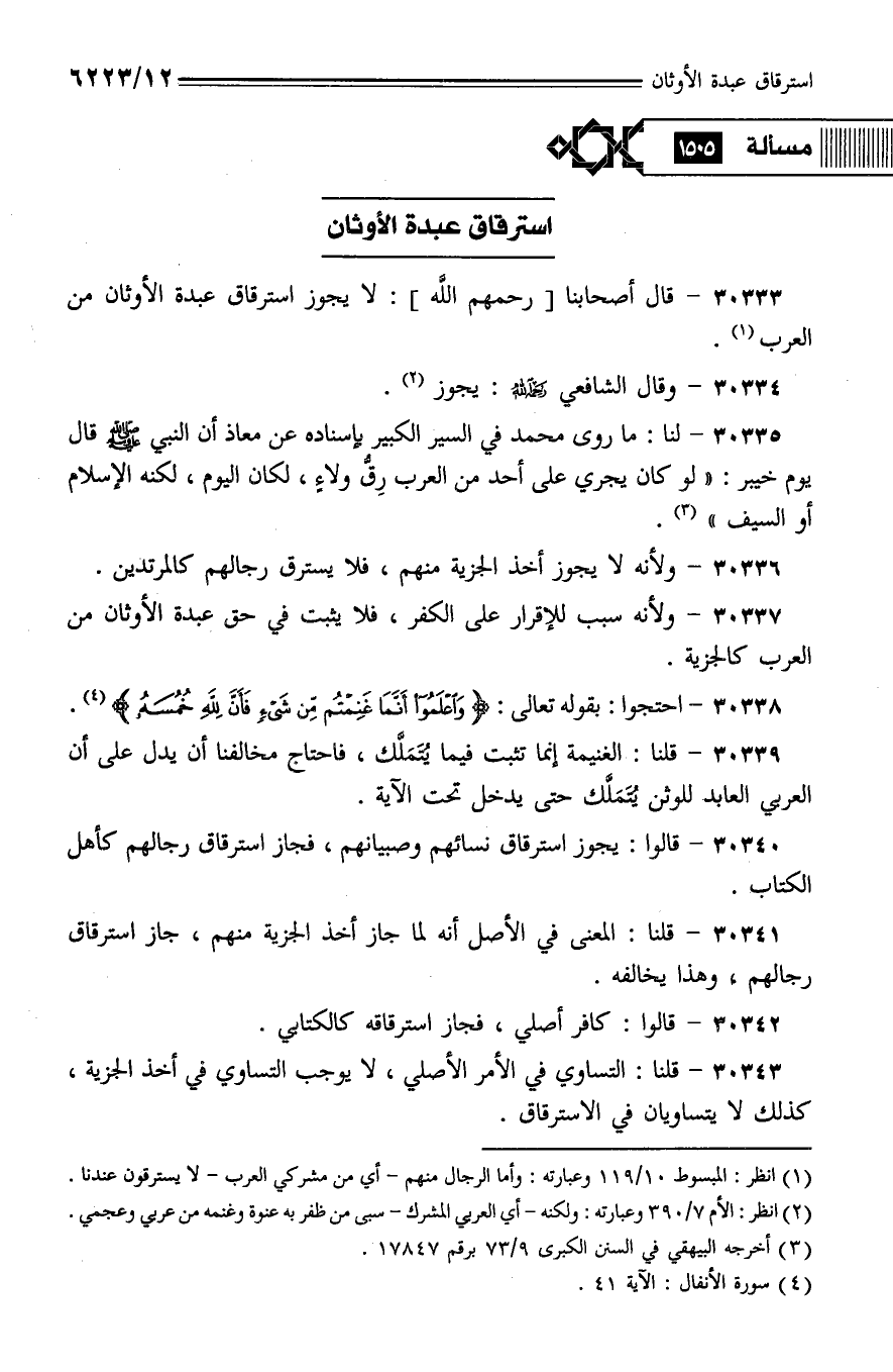 30333 - قال أصحابنا [رحمهم الله]: لا يجوز استرقاق عبدة الأوثان من العرب.