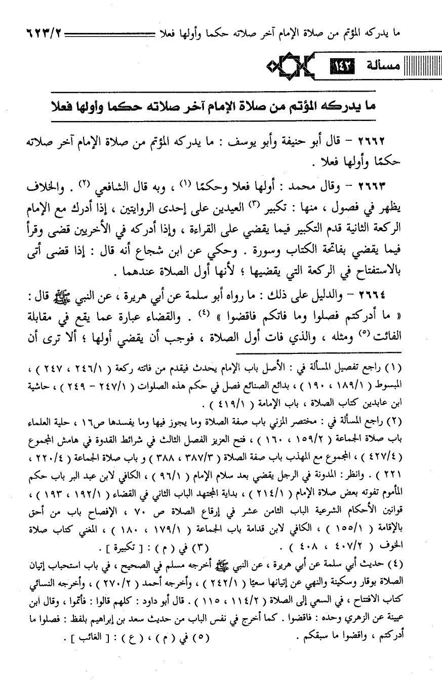 2662 - قال أبو حنيفة وأبو يوسف: ما يدركه المؤتم من صلاة الإمام آخر صلاته حكما وأولها فعلا.