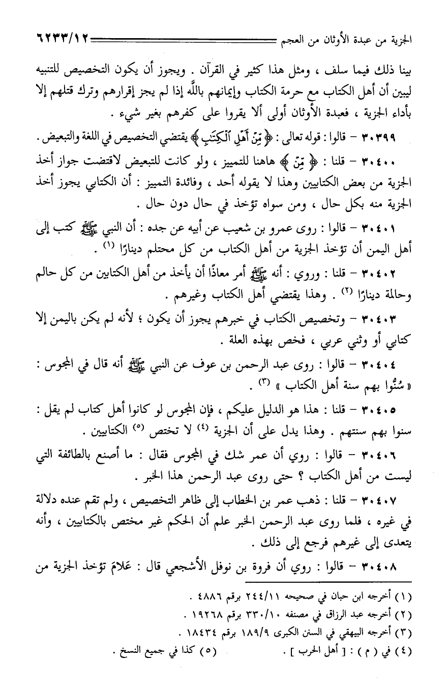30405 - قلنا: هذا هو الدليل عليكم، فإن المجوس لو كانوا أهل كتاب لم يقل: سنوا بهم سنتهم. وهذا يدل على أن الجزية لا تختص الكتابيين.