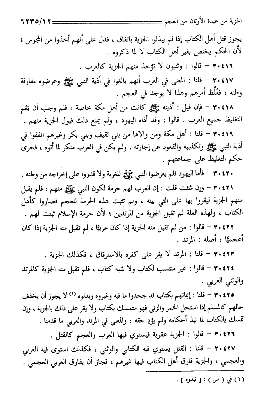 30426 - قالوا: الجزية عقوبة فيستوي فيها العرب والعجم كالقتل.