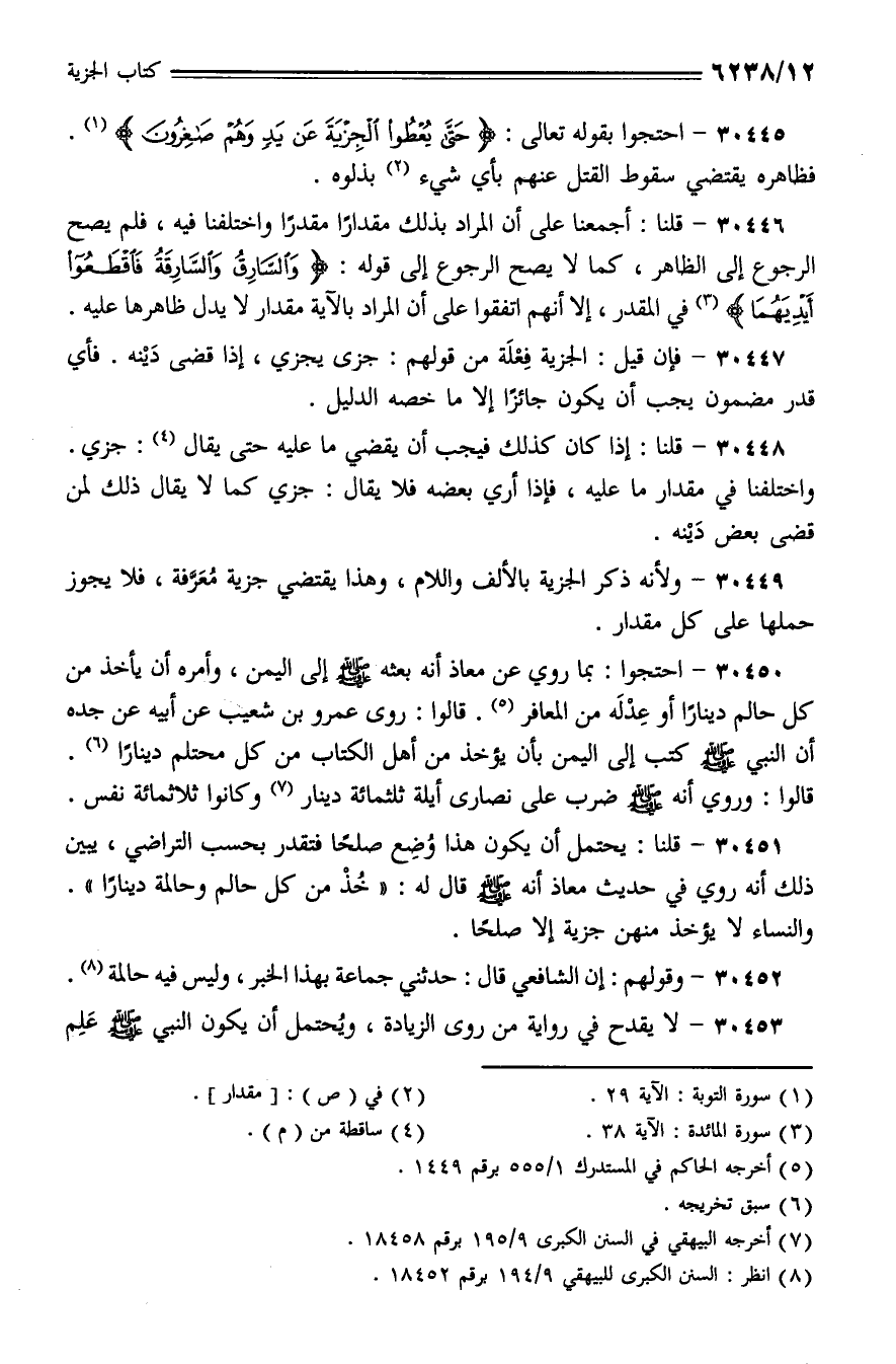 30445 - احتجوا بقوله تعالى: {حتى يعطوا الجزية عن يد وهم صغرون}. فظاهره يقتضي سقوط القتل عنهم بأي شيء بذلوه.