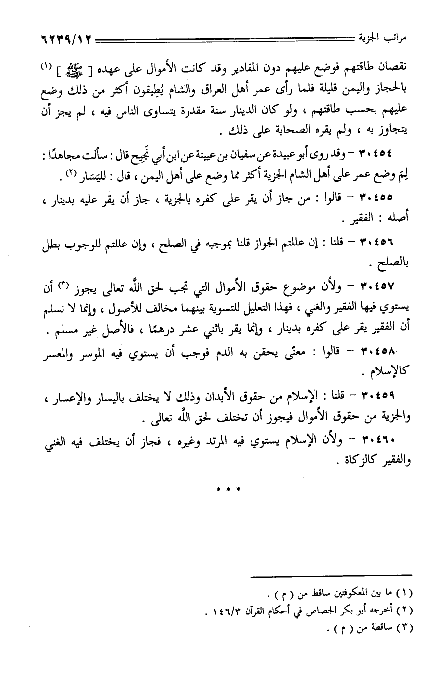 30457 - ولأن موضوع حقوق الأموال التي تجب لحق الله تعالى يجوز أن يستوي فيها الفقير والغني، فهذا التعليل للتسوية بينهما مخالف للأصول، وإنما لا نسلم أن الفقير يقر على كفرة بدينار، وإنما يقر باثني عشر درهمًا، فالأصل غير مسلم.