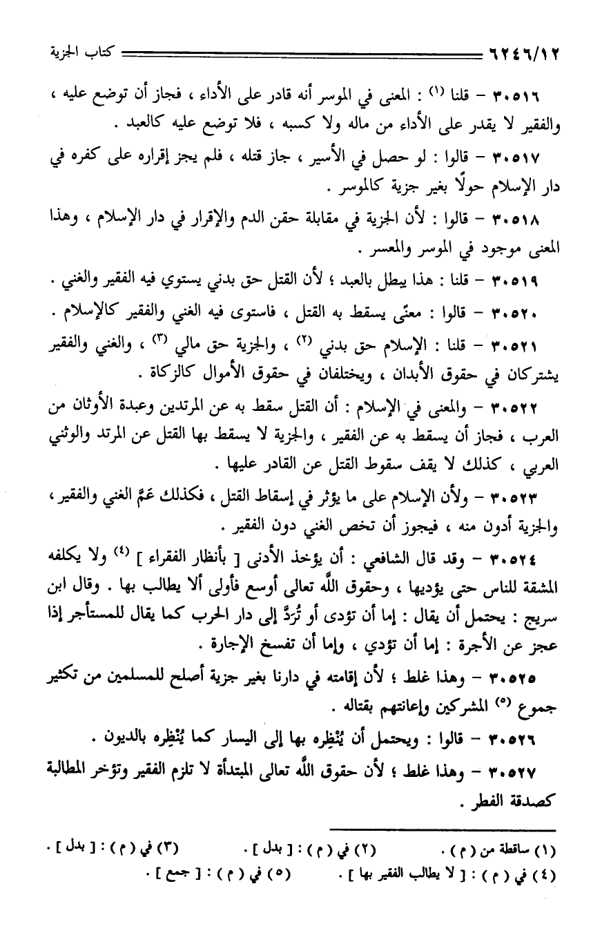 30518 - قالوا: لأن الجزية في مقابلة حقن الدم والإقرار في دار الإسلام، وهذا المعنى موجود في الموسر والمعسر.