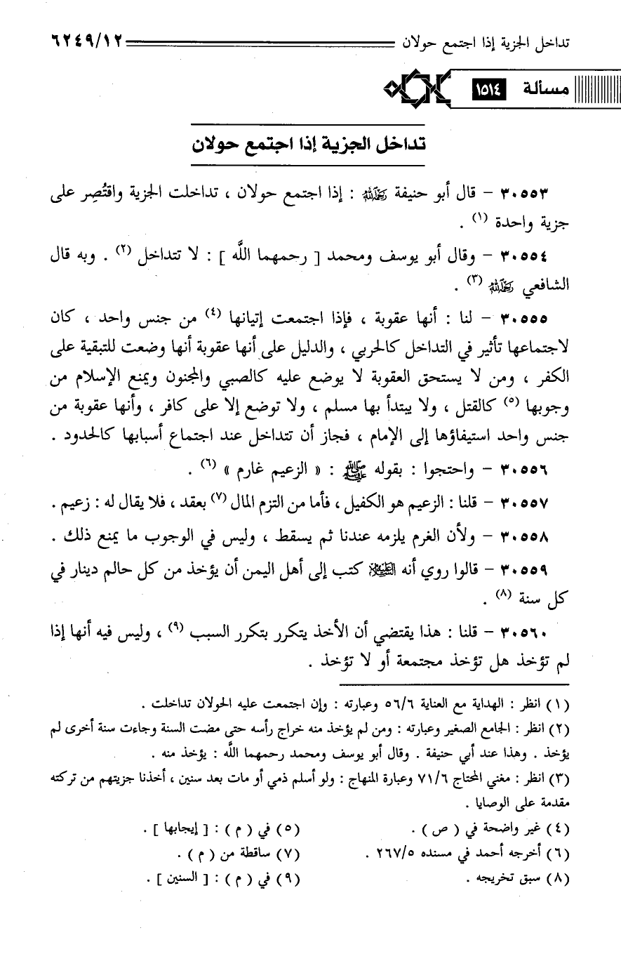 30555 - لنا: أنها عقوبة، فإذا اجتمعت إتيانها من جنس واحد، كان لاجتماعها تأثير في التداخل كالحربي، والدليل على أنها عقوبة أنها وضعت للتبقية على الكفر، ومن لا يستحق العقوبة لا يوضع عليه كالصبي والمجنون ويمنع الإسلام من وجوبها كالقتل، ولا يبتدأ بها مسلم، ولا توضع إلا على كافر، وأنها عقوبة من جنس واحد استيفاؤها إلى الإمام، فجاز أن تتداخل عند اجتماع أسبابها كالحدود.
