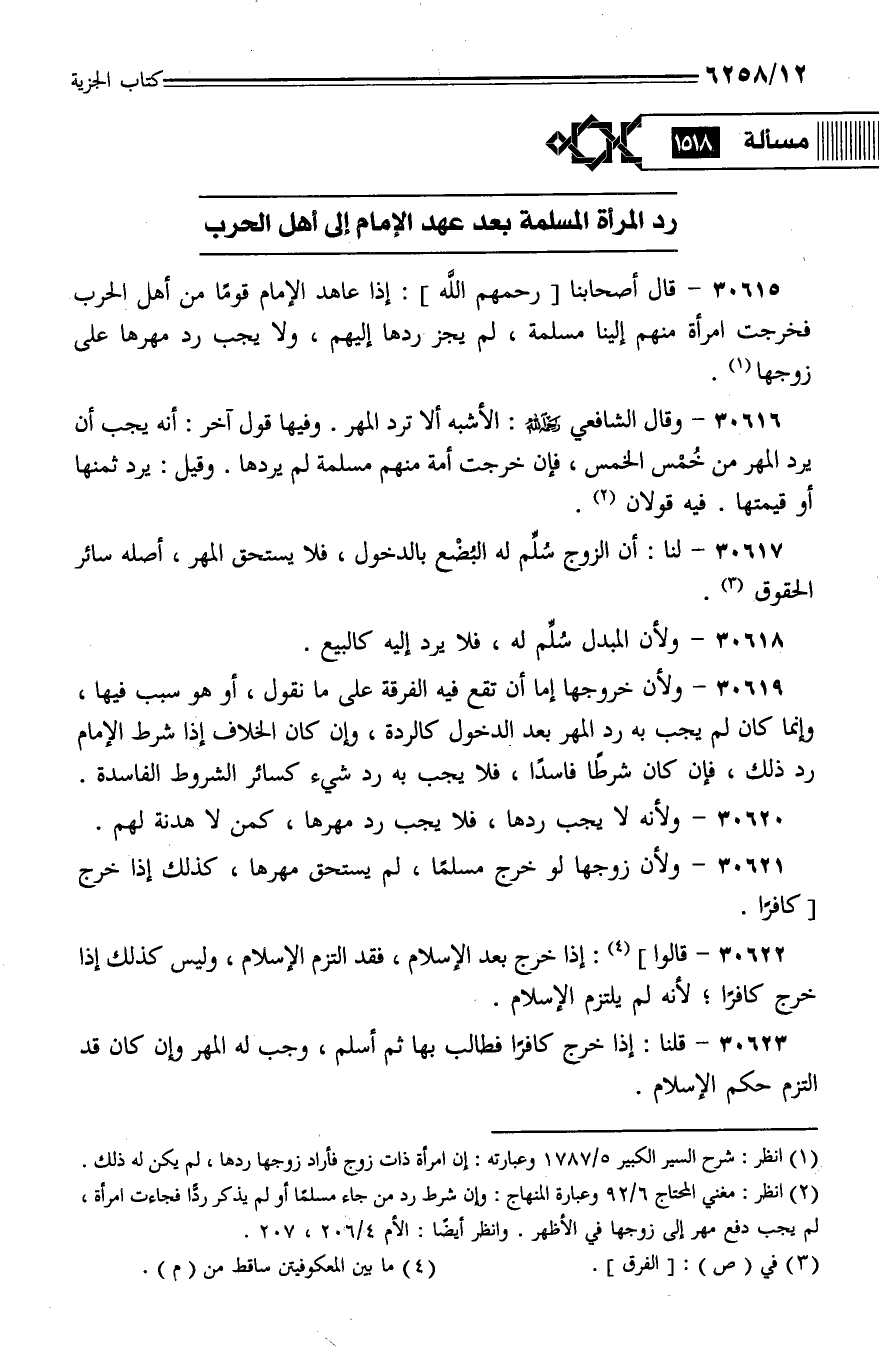 30615 - قال أصحابنا [رحمهم الله]: إذا عاهد الإمام قومًا من أهل الحرب فخرجت امرأة منهم إلينا مسلمة، لم يجز ردها إليهم، ولا يجب رد مهرها على زوجها.