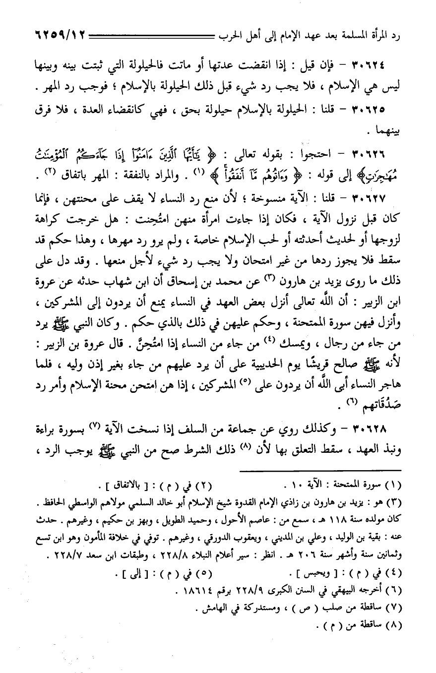 30628 - وكذلك روي عن جماعة من السلف إذا نسخت الآية بسورة براءة ونبذ العهد، سقط التعلق بها لأن ذلك الشرط صح من النبي - صلى الله عليه وسلم - يوجب الرد،