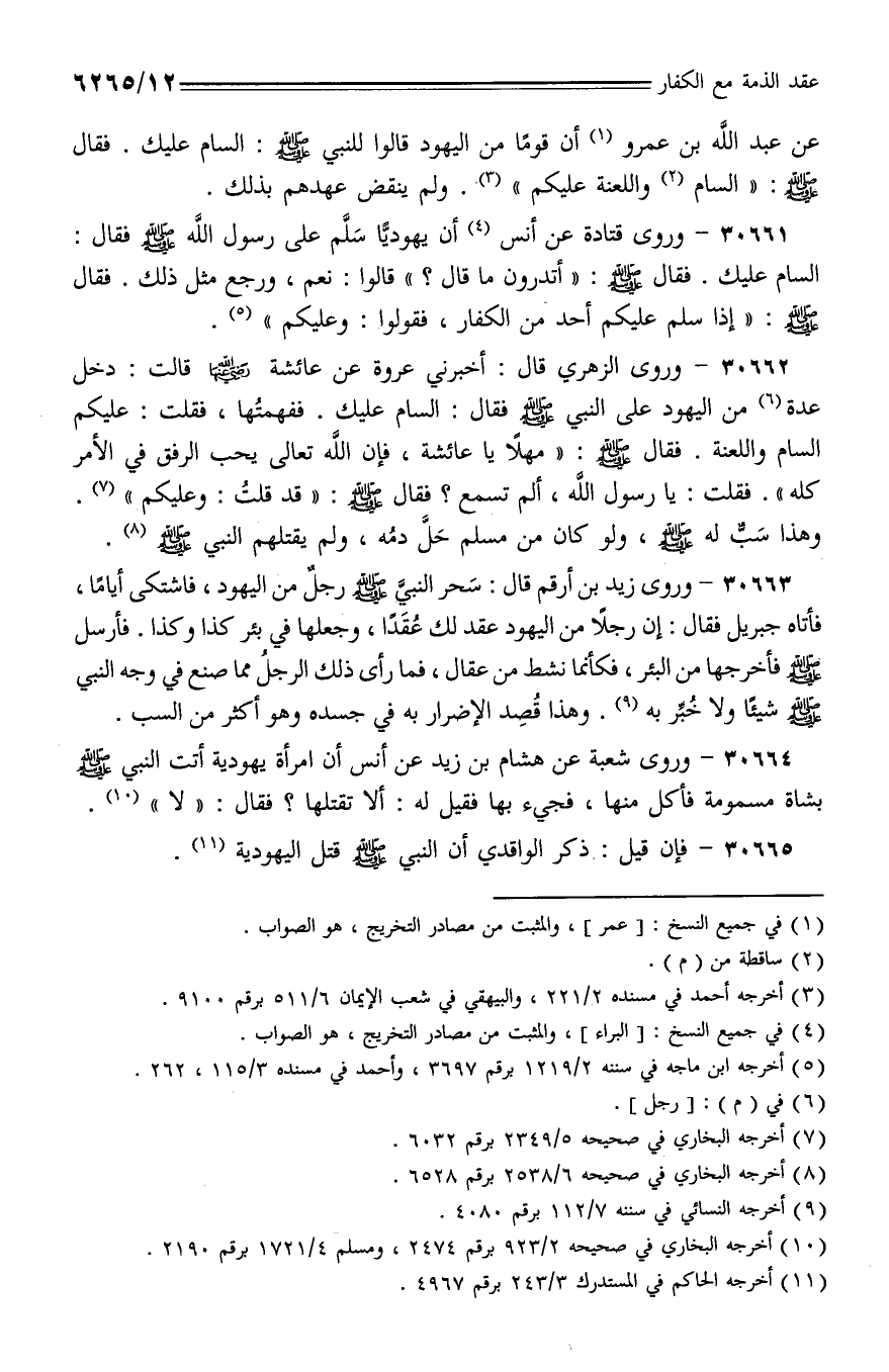 30662 - وروى الزهري قال: أخبرني عروة عن عائشة رضي الله عنها قالت: دخل عدة من اليهود على النبي - صلى الله عليه وسلم - فقال: السام عليك. ففهمتها، فقلت: عليكم السام واللعنة. فقال - صلى الله عليه وسلم -: (مهلًا يا عائشة، فإن الله تعالى يحب الرفق في الأمر كله). فقلت: يا رسول الله، ألم تسمع؟ فقال - صلى الله عليه وسلم -: (قد قلت: وعليكم).