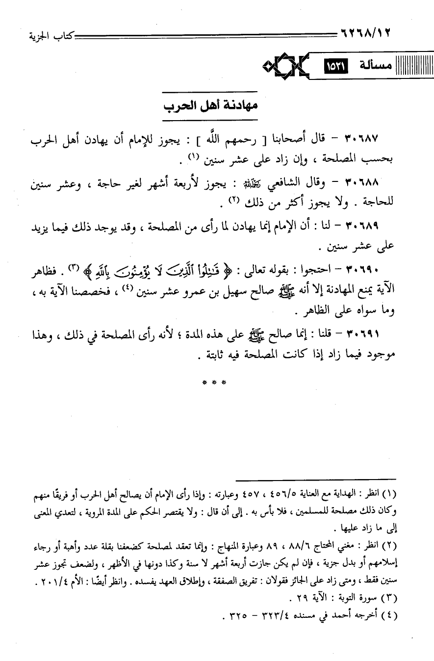 30687 - قال أصحابنا [رحمهم الله]: يجوز للإمام أن يهادن أهل الحرب بحسب المصلحة، وإن زاد على عشر سنين.