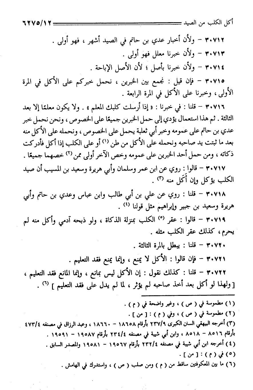 30716 - قلنا: في خبرنا: (إذا أرسلت كلبك المعلم). ولا يكون معلمًا إلا بعد الثالثة. ثم هذا استعمال يؤدي إلى حمل الخبرين جميعًا على الخصوص، ونحن نحمل خبر عدي بن حاتم على عمومه وخبر أبي ثعلبة يحمل على الخصوص، ونحمله على الأكل منه بعد ما ثبتت يد صاحبه ونحمله على الأكل من طن أو على الكلب إذ أكل فأدركت ذكاته، ومن حمل أحد الخبرين على عمومه وخص الآخر أولى ممن خصهما جميعًا.