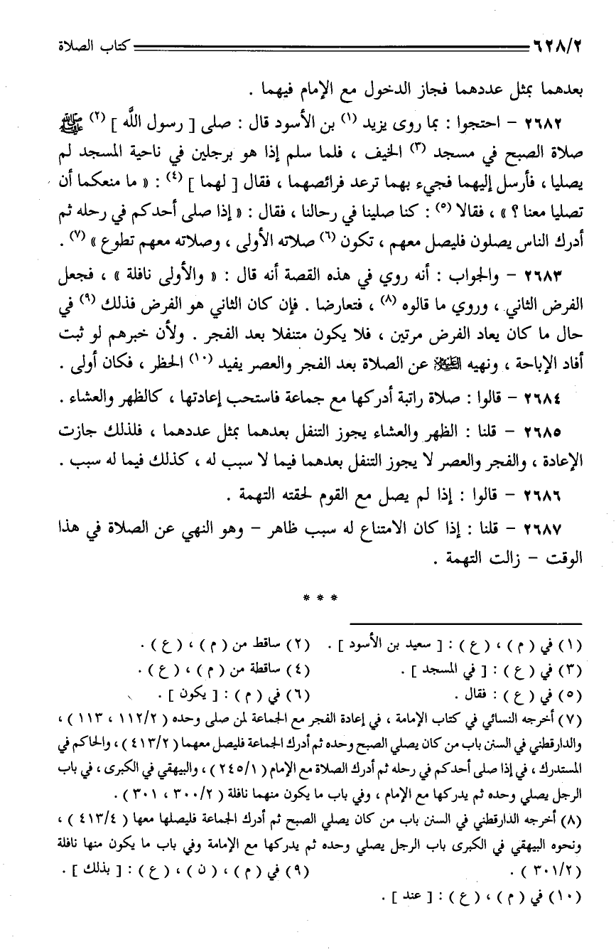 2682 - احتجوا: بما روى يزيد بن الأسود قال: صلى [رسول الله]- صلى الله عليه وسلم - صلاة الصبح في مسجد الخيف، فلما سلم إذا هو برجلين في ناحية المسجد لم يصليا، فأرسل إليهما فجيء بهما ترعد فرائصهما، فقال [لهما]: (ما منعكما أن تصليا معنا؟)، فقالا: كنا صلينا في رحالنا، فقال: (إذا صلى أحدكم في رحله ثم أدرك الناس يصلون فليصل معهم، تكون صلاته الأولى، وصلاته معهم تطوع).