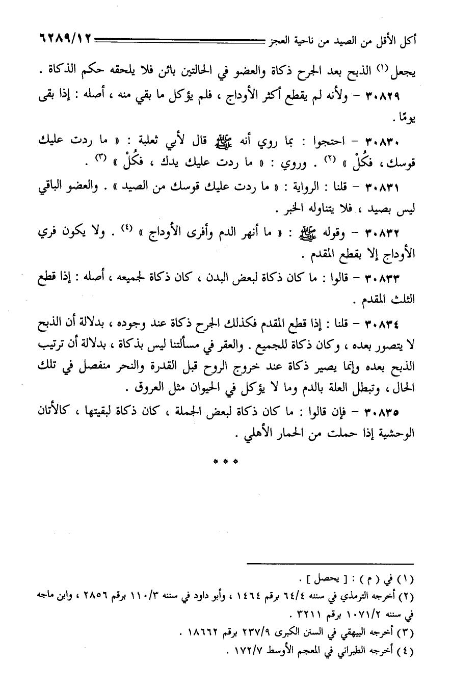 30830 - احتجوا: بما روي أنه - صلى الله عليه وسلم - قال لأبي ثعلبة: (ما ردت عليك قوسك، فكل). وروي: (ما ردت عليك يدك، فكل).
